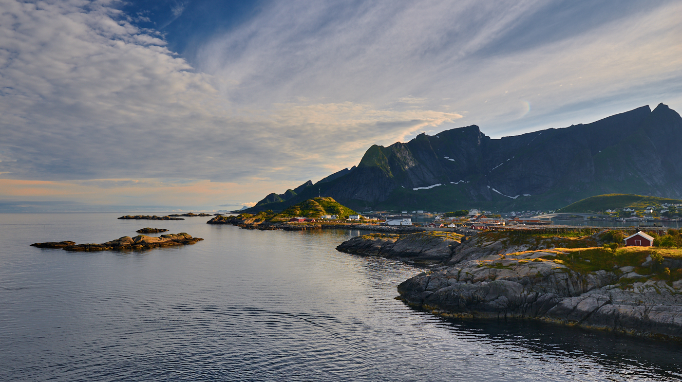 Widok z mostu w Hamnoy na Reinebringen i rozpościerające pod nim Reine.