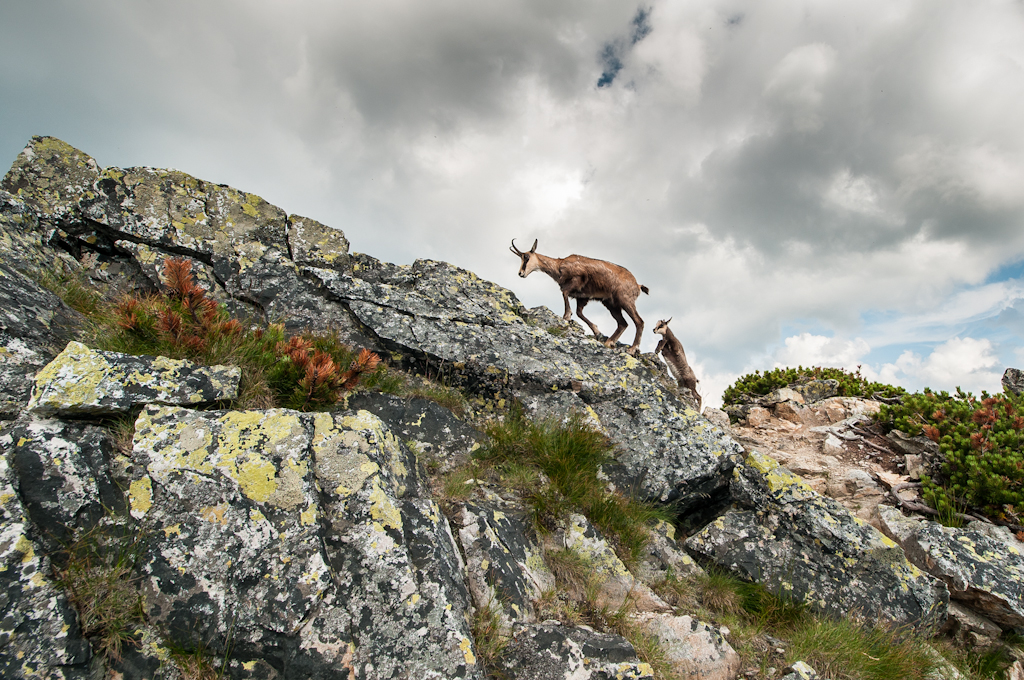 Takiego bliskiego spotkania to jeszcze nie miałem :) , jakieś 3-5 metrów od nich. Skradaliśmy się powoli w ich kierunku, z tyłu jak widać na jednej fotce ktoś robił im zdjęcia i zamykał ścieżkę, zaczynałem się obawiać czy im do głowy nie przyjdzie użyć tych rogów :) , ale polazły po skałach w bok spokojnym krokiem, a potem patrzyły na nas z góry :grin: co też widać na fotce :)