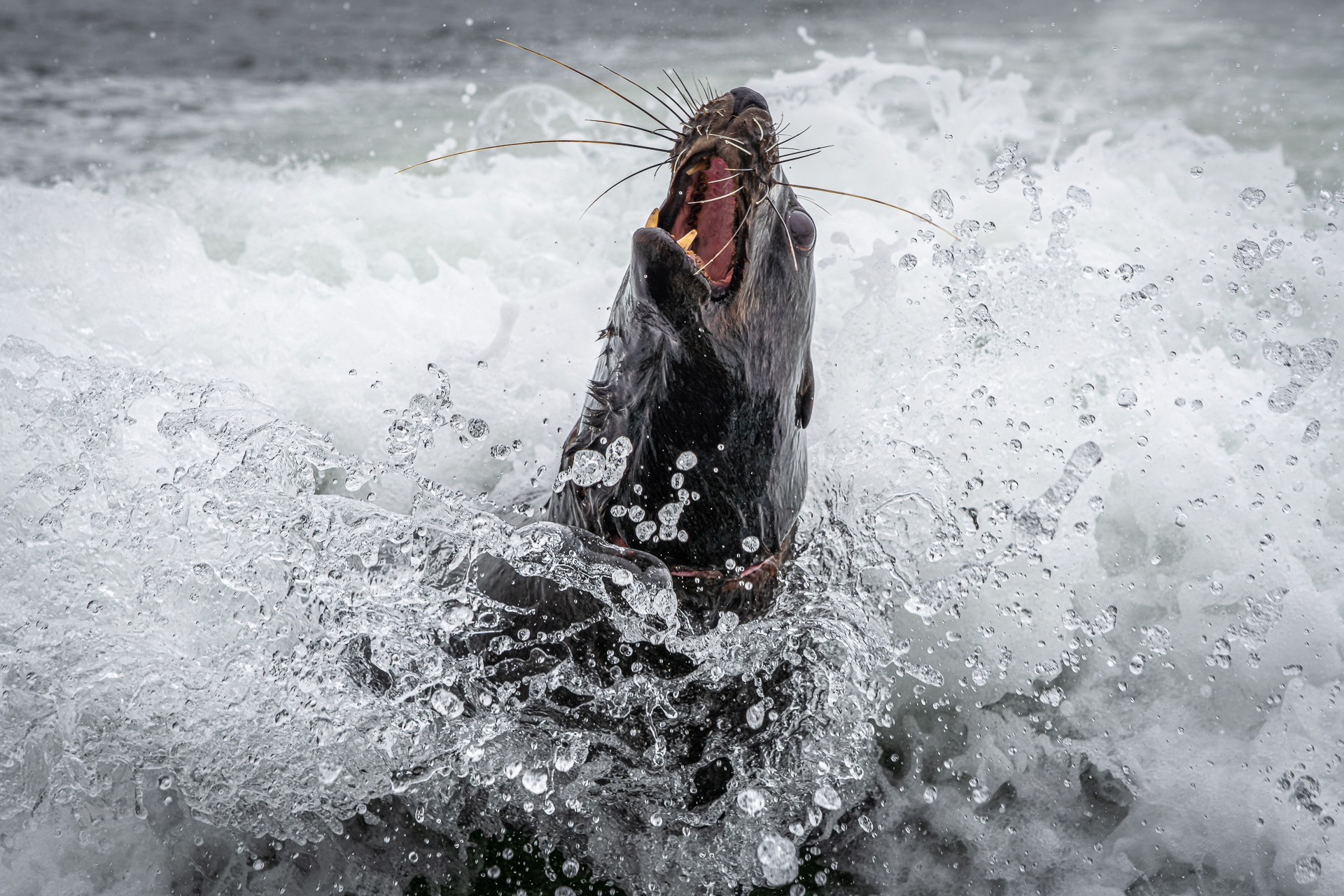 324. Kotik afrykański (Arctocephalus pusillus) żyjący wzdłuż południowych wybrzeży Afryki niejednokrotnie jest traktowany jako atrakcja turystyczna. Osobnik ze zdjęcia wyskakuje spomiędzy fal próbując złapać martwe ryby rzucane mu z łodzi ku uciesze turystów. Uwagę przyciąga również rana wokół szyi, która powstała prawdopodobnie wskutek zaplątania się kotika w śmieci pływające w morzu.