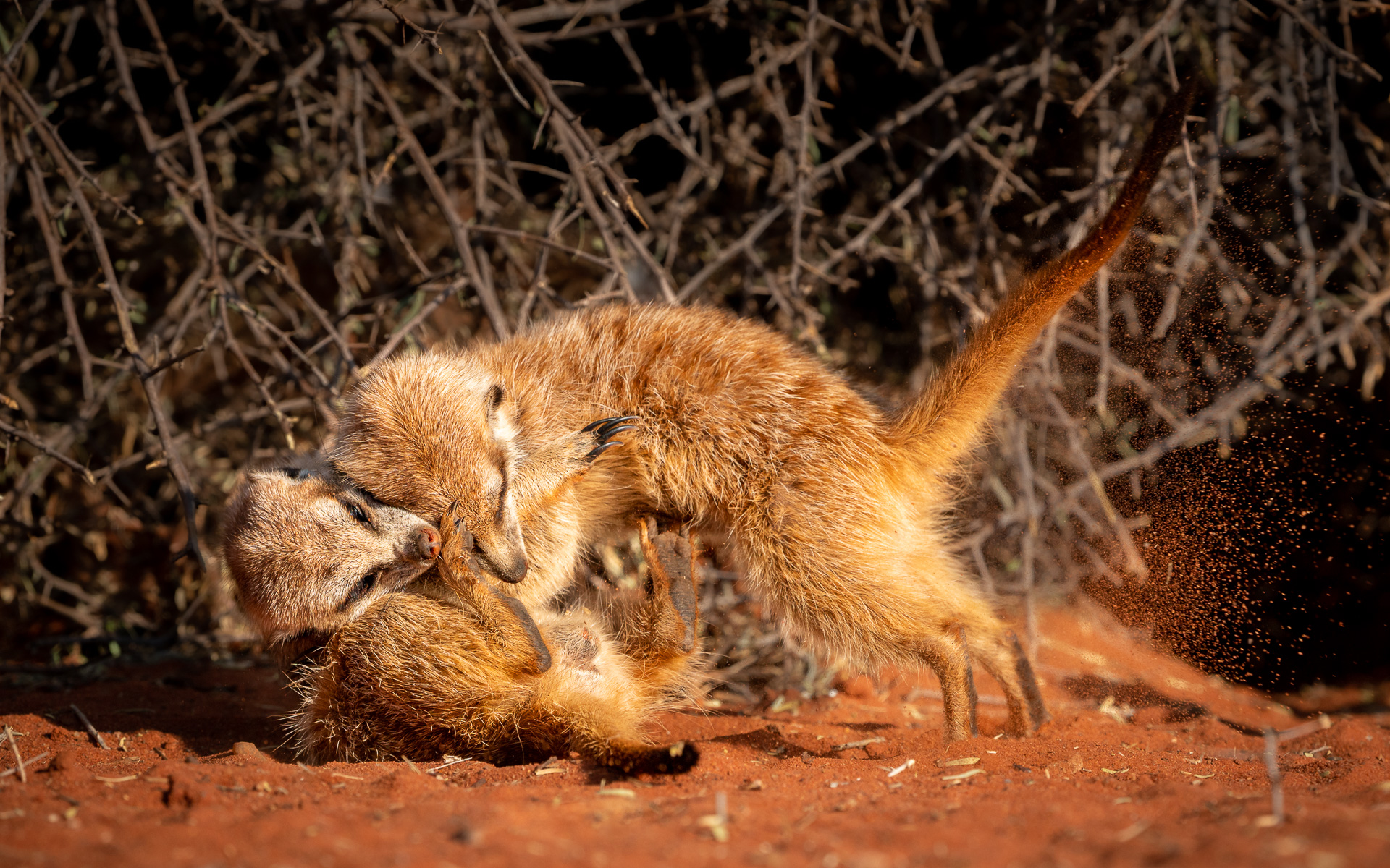 330. Surykatki nie lubią nudy. Po przespanej nocy i porannym ładowaniu "akumulatorów" ciepłem słonecznym, mają nadmiar energii, którą próbują wyładować na różne sposoby. Jeżeli akurat nie szukają pożywania lub ewentualnie nie kopią kolejnej nory to zaczepiają innych członków stada i walczą ze sobą, chyba tylko po to, żeby nie siedzieć bezczynnie.
