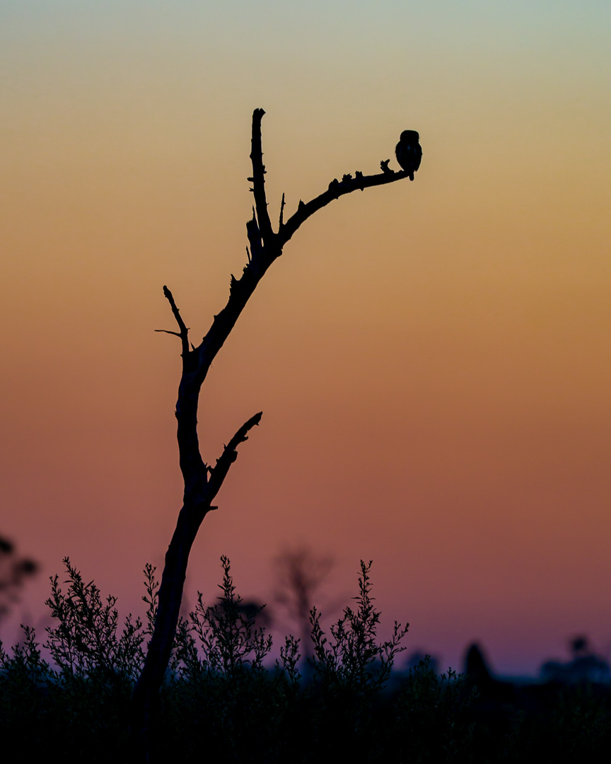 333. Sóweczka plamobrzucha (Glaucidium capense) to dość popularna afrykańska sowa jednak ze względu na niewielki rozmiar oraz to, że jest aktywna wczesnym rankiem i o zmierzchu powoduje, że trudno ją zaobserwować. W Botswanie udało się ją złapać podczas porannego polowania, siedzącą na uschniętym drzewie w otwartym terenie.