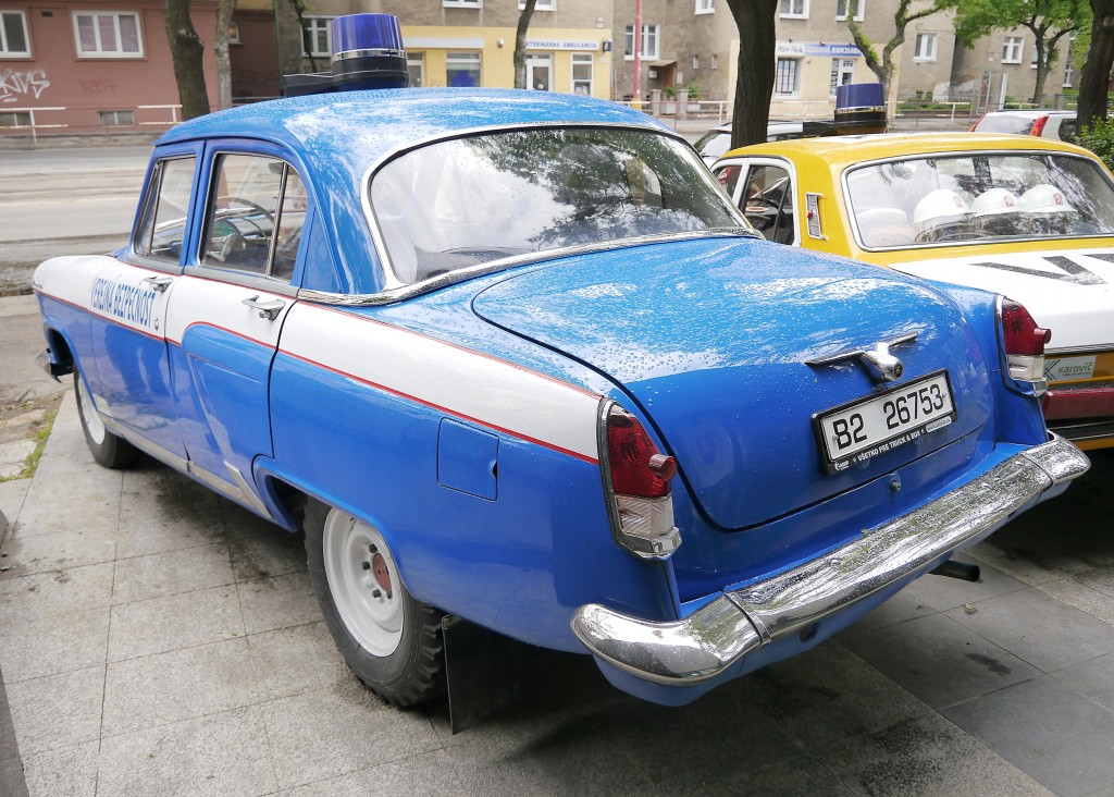 Kolejna maszyna z Bratysławy używana niegdyś przez VB - GAZ-21 Wołga. Samochód tego typu produkowano w latach 1956-70, także w odmianie kombi (GAZ-22). Był to następca pojazdu GAZ-M-20 Pobieda, znanego u nas lepiej pod nazwą Warszawa M-20. Powstały trzy zasadnicze wersje GAZ-21 różniące się przede wszystkim zmianami przedniej części nadwozia, choć nie tylko. Pierwszy wariant produkcyjny wyposażono standardowo w automatyczną skrzynię biegów o trzech przełożeniach, jednak wyprodukowano tylko niewielką serię kilkuset sztuk. W późniejszych modelach stosowano już prostsze w produkcji i eksploatacji 3-biegowe przekładnie mechaniczne. Wołgi wytwarzano nie tylko na potrzeby ZSRR, lecz także na eksport. Sprzedaż obejmowała prócz ''zaprzyjaźnionych krajów'' również rynki zachodnie. Co ciekawe belgijska firma Scaldia montowała te auta z importowanymi silnikami Diesla takich producentów jak : Rover, Perkins, czy Indenor-Peugeot i sprzedawała je pod nazwą Volga-Scaldia. W niewielkich ilościach GAZ budował też odmiany dostosowane do ruchu lewostronnego oraz takie, które miały być używane w państwach o gorącym klimacie. Oprócz tego wytwarzano model zaadaptowany do zadań taksówki z nieco zubożonym wyposażeniem i wykończeniem wnętrza. Mało znany jest fakt uczestnictwa pojazdów GAZ-21 w rajdach organizowanych zarówno w ZSRR, jak i zagranicznych np. w Finlandii. Zdjęcia przedstawiają ostatnią najliczniejszą i najpopularniejszą serię produkcyjną z lat 1962-70.