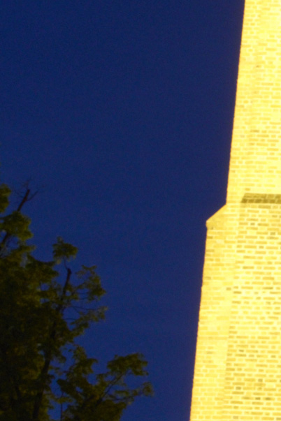 No i zrobiłem! Wylazłem w noc, znalazłem sobie wdzięczny obiekt oświetlony stałym, nie zmieniającym się światłem, postawiłem aparaty na statywie, wyłączyłem stabilizację, użyłem 2-sekundowego samowyzwalacza, żeby nic nie poruszyć, balans bieli ustawiłem na "żarówkę" i stosując te same parametry ekspozycji zrobiłem serię zdjęć, podnosząc czułość o 1 EV i o tyle samo skracając czas ekspozycji, a przysłonę pozostawiając bez zmian. "Te same parametry" należy potraktować jako "możliwie najbardziej zbliżone parametry", ponieważ Fuji stosuje trochę niestandardowe czasy, np. 8,5 s zamiast 8 s lub 4,3 s zamiast 4 s. Różnice te są jednak śladowe, można je pominąć. Rawy wywołałem w LR5, wyłączając odszumianie, ponieważ soft ten standardowo usuwa nieco kolorowego szumu. Skutkiem tego było wyższe zaszumienie sampli, ale ciemne kolory, jak np. liście drzew, odzyskały zieleń. Same zdjęcia to jednak nic w porównaniu do zabawy w wycinanki, która zakończyła się tak: