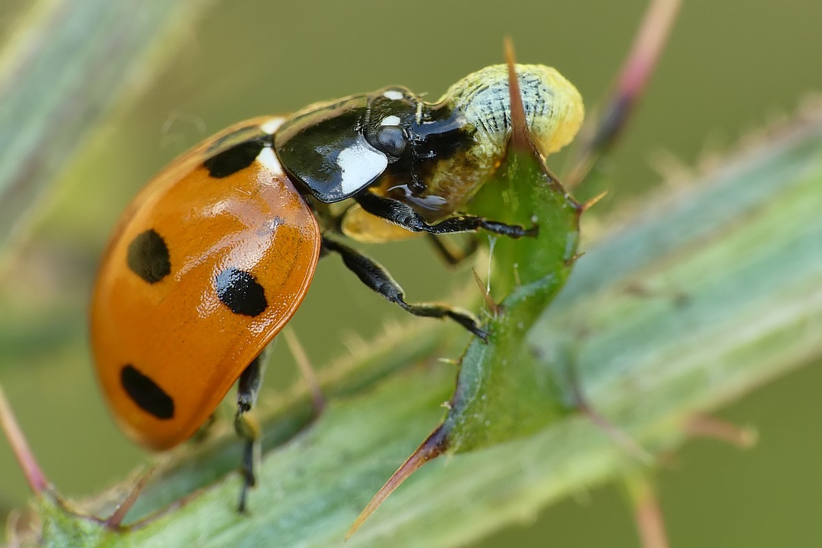 Biedronka zjadająca larwę jakiejś muchówki: