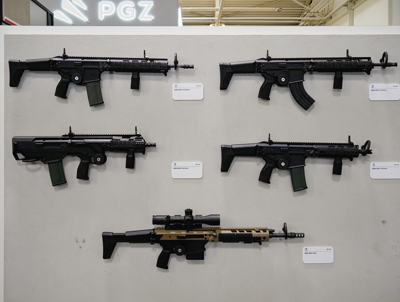 Przegląd sprzętu rozpocznę, od polskiego stoiska PGZ-tu, na którym eksponowano między innymi, kilka wersji karabinków MSBS Grot.
