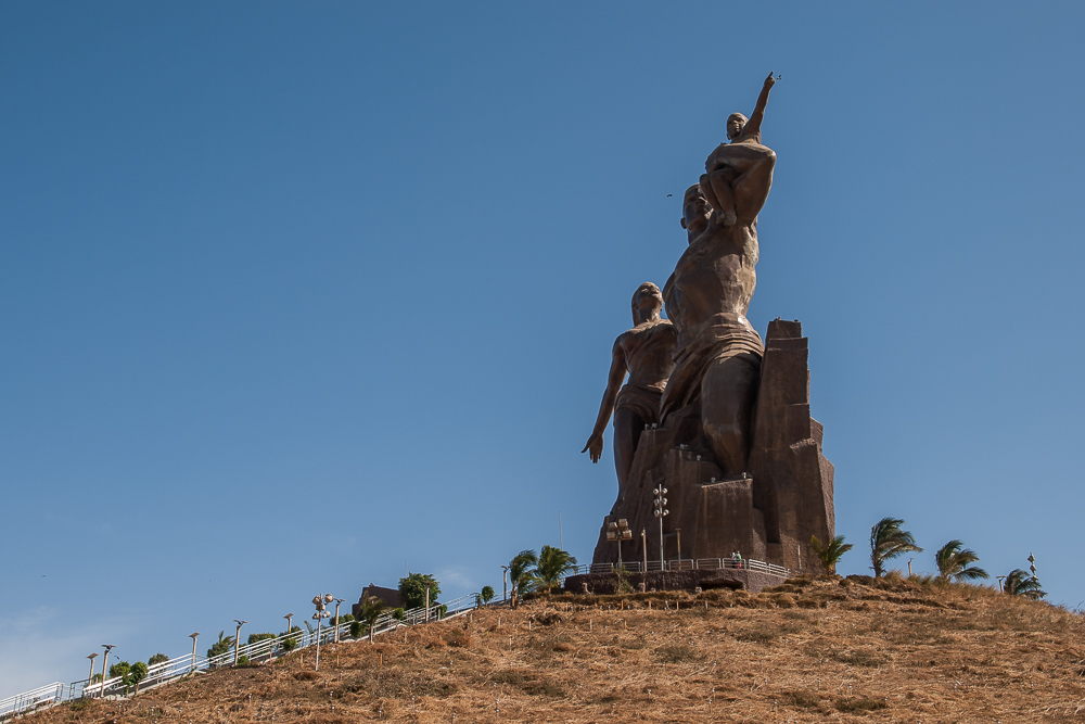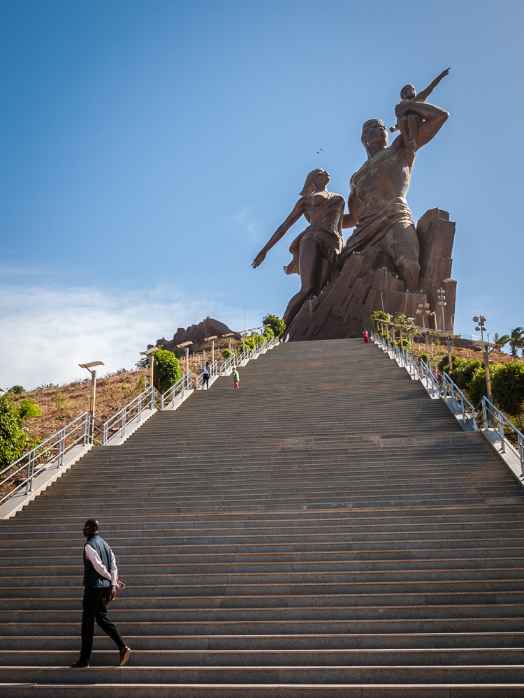 Pomnik Afrykańskiego Odrodzenia symbolizujący wyjście z wieków rasizmu i nietolerancji. Taka trochę socrealistyczna kompozycja została zaprojektowana przez samego prezydenta Wade, a zrealizowana przez północno - koreańską firmę z Pyongyangu :shock: Monument budzi wśród mieszkańców Dakaru wiele kontrowersji, bo prezydent jako pomysłodawca i projektant bierze 35% zysku z biletów. Nie podobają się też muzułmanom (94% ludności) półnagie postacie na monumencie, tym bardziej, że jest to pierwszy widok jaki widzą przylatujący do stolicy Senegalu :)