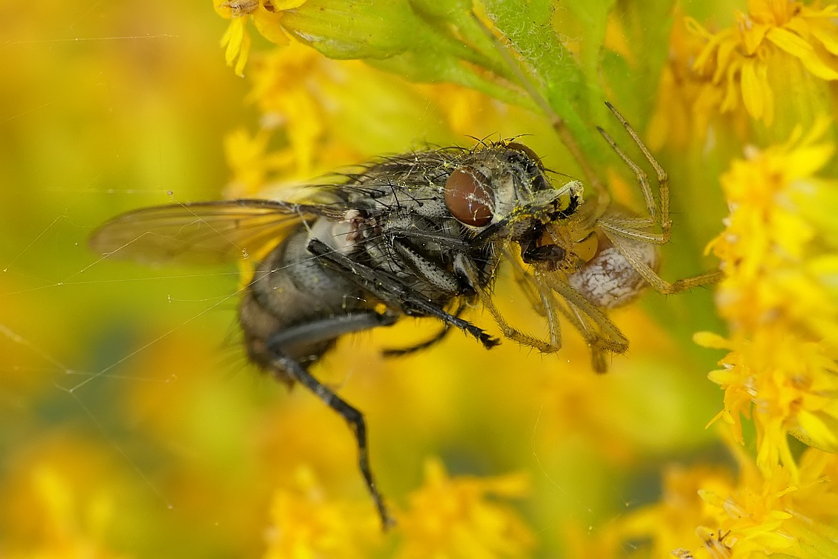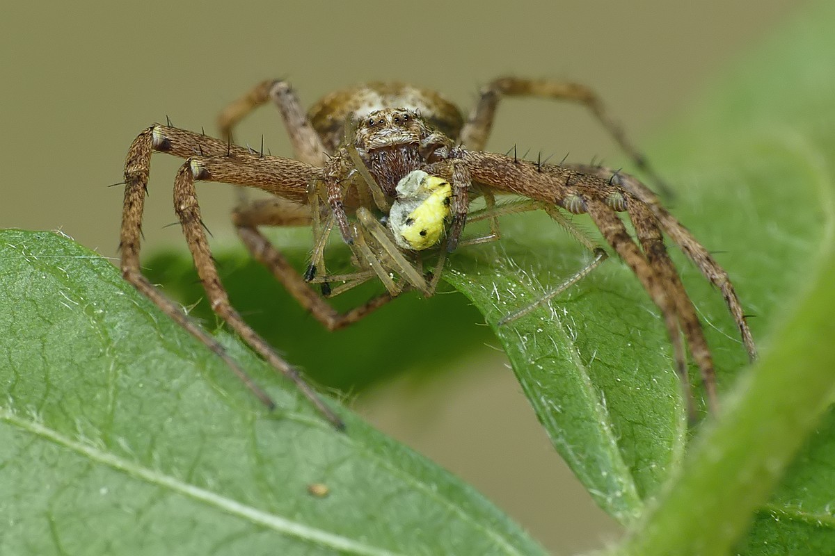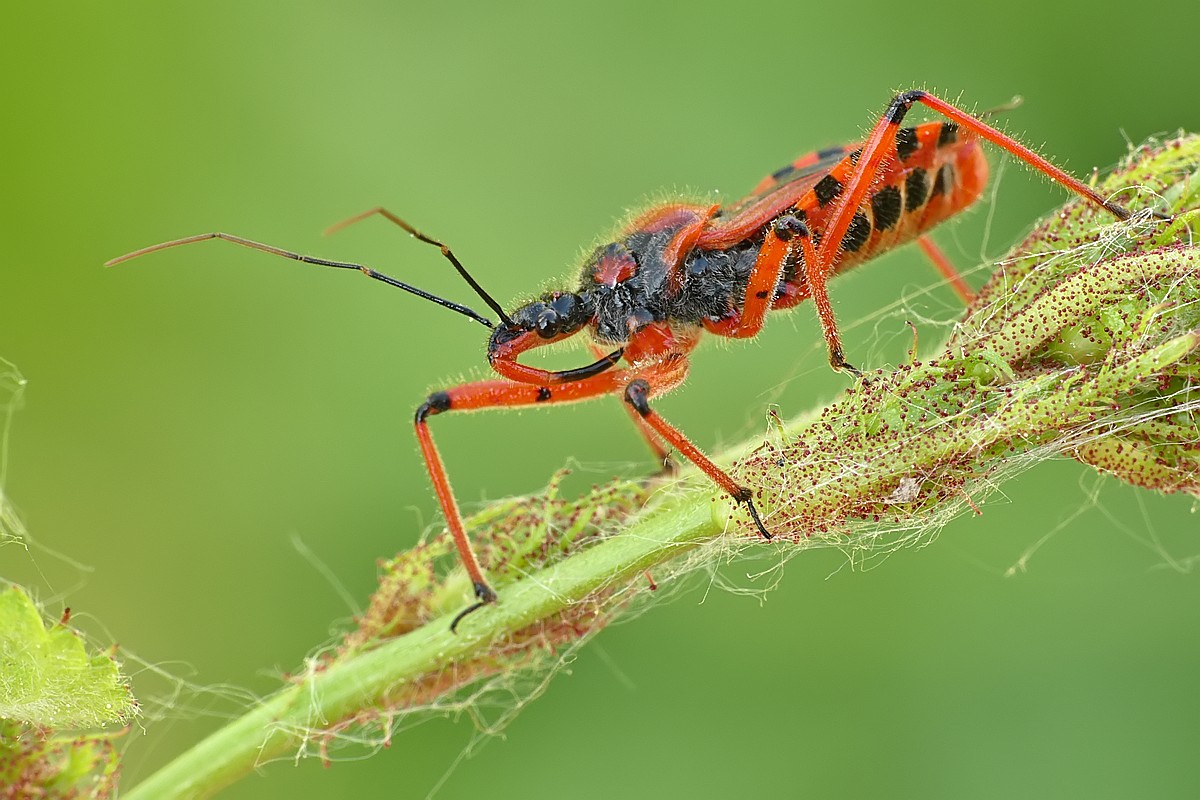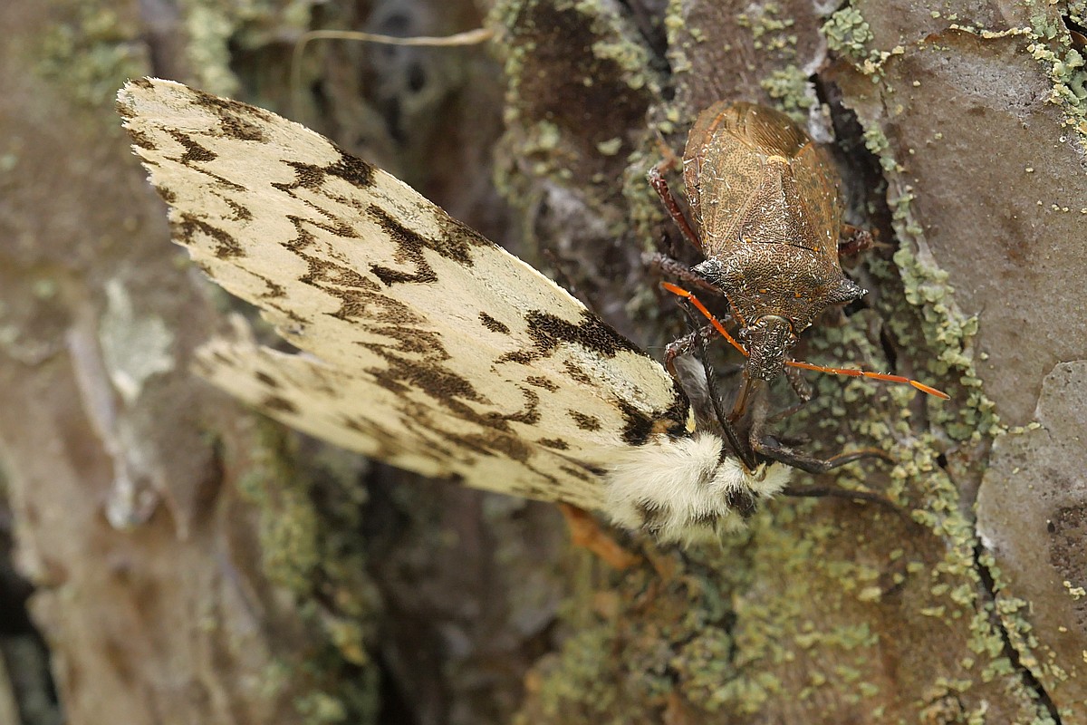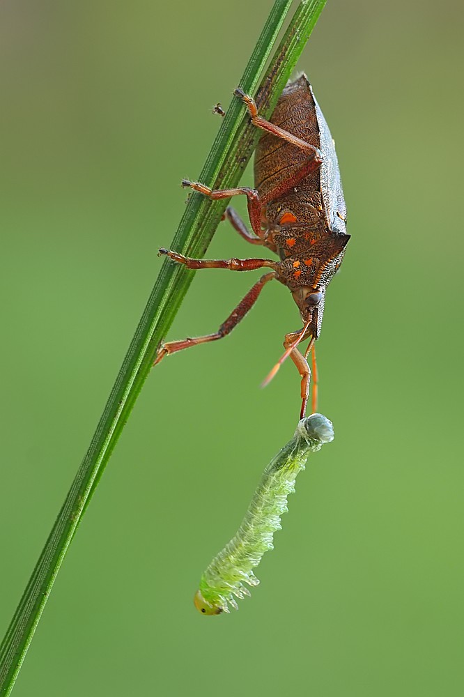W dzisiejszym odcinku - drapieżny pluskwiak - srogoń baldaszkowiec. Jako ciekawostka - na pierwszym zdjęciu w tle widać innego pluskwiaka, który akurat podczas robienia zdjęcia... spadał z wyżej położonego liścia: