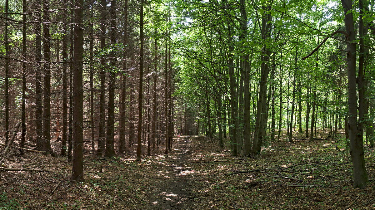 Ciekawostka. Po lewej Słowacja, po prawej Polska. Nie wiem czym to było podyktowane. Słowacy nasadzili jodły i wszystko uschło. Po Polskiej stronie są drzewa liściaste, a i las jest piękny i zielony.