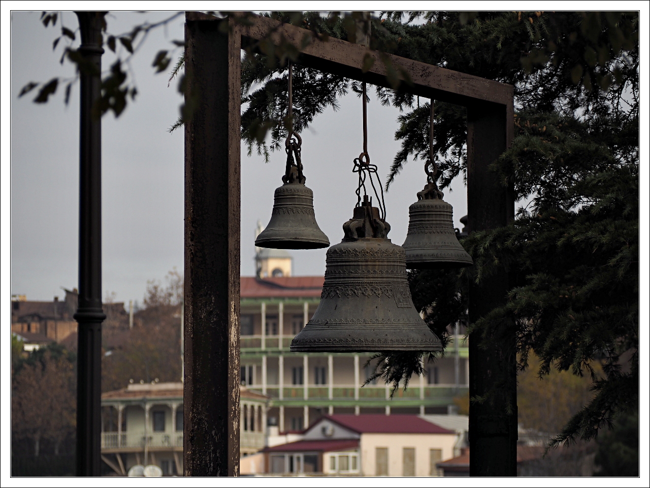 Skoro temat dzwonów został już wywołany to pociągnijmy go trochę. Bo dzwony nie dość że są ciekawym obiektem do fotografowania to jeszcze w Gruzji często zdarza się je widywać. Z dwóch powodów. Po pierwsze, to wiadomo - Gruzja to kraj chrześcijański a Chrześcijanie wszelkich odłamów dzwony mają w wielkim szacunku. Po drugie, o ile przy nowszych czy bogatszych świątyniach dzwony pochowane są w murowanych dzwonnicach (fot 68 ) to kościołach najstarszych, czy też po prostu mniejszych, biedniejszych, zawieszone są na prostych stalowych (kiedyś pewnie drewnianych) konstrukcjach. Ot, takich jakie kiedyś pokazywałem w Dżwari (fot. 124).