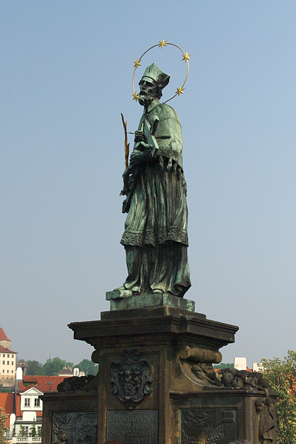 W Pradze obie strony Mostu Karola udekorowane są całymi rzędami pomników - jest tam ich kilkadziesiąt. Niestety o ile się nie przyjdzie wcześnie rano fotografowanie utrudniają tłumy turystów przewijających się przez most - i dolną część pomnika przesłaniają ich głowy - po wykadrowaniu wygląda to tak: