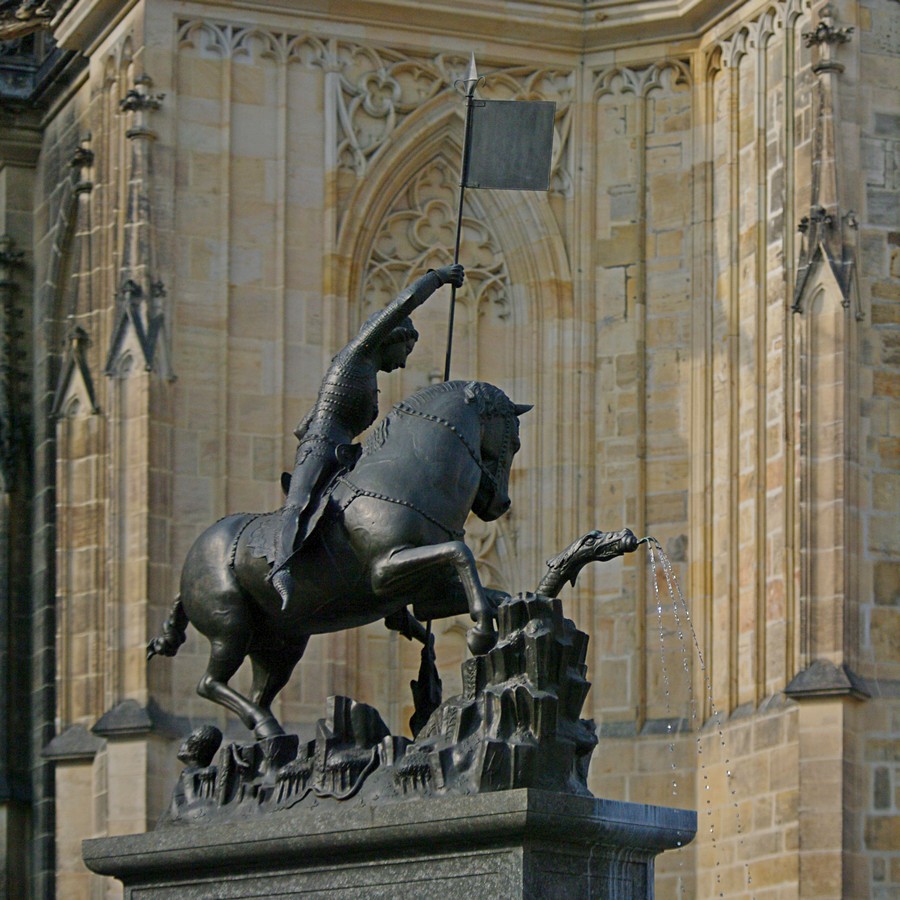 Figura Św. Jerzego walczącego ze smokiem stojąca obok katedry Św. Wita na dziedzińcu praskiego zamku Hradcany: