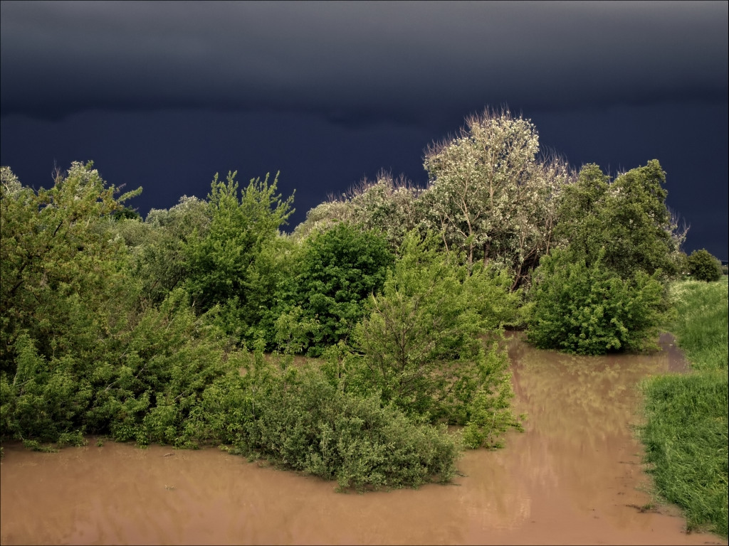 Nowy Korczyn, Nida, ubiegłoroczna powódź, z tyłu słońce, a z przodu nadciąga ściana deszczu.