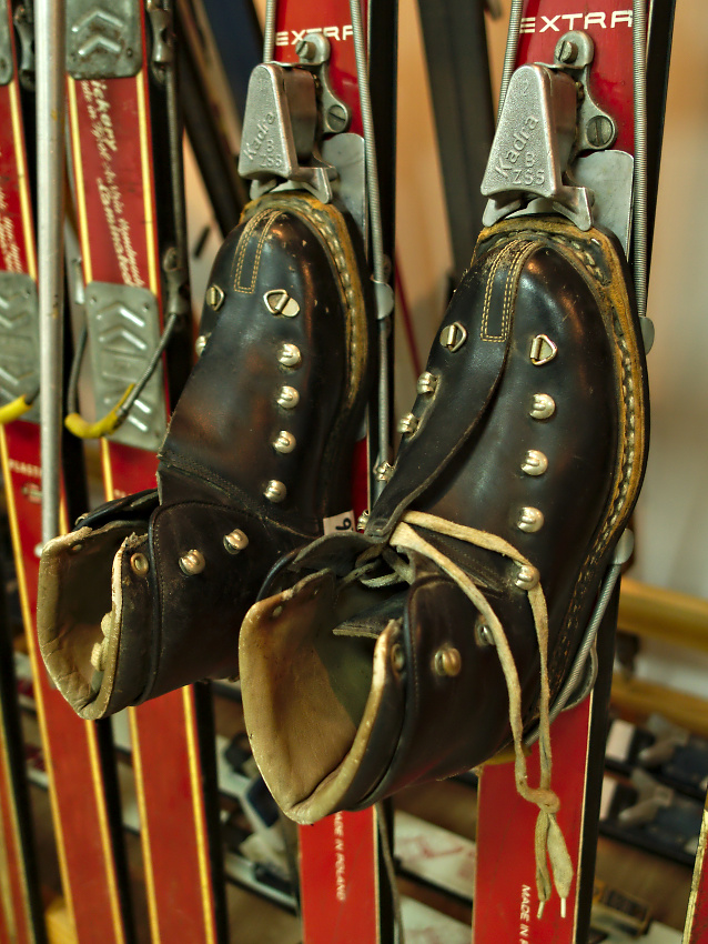 Tak patrzę na te stare buty - solidne szycie, skóra. Fajne. A obok plastiki tandetnie wyglądające. Kurde, nie lubię plastiku ani w kuchni, ani w fotografii. Czy w narciarstwie - nie wiem bo nie jeżdżę.