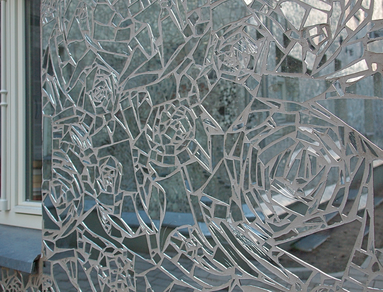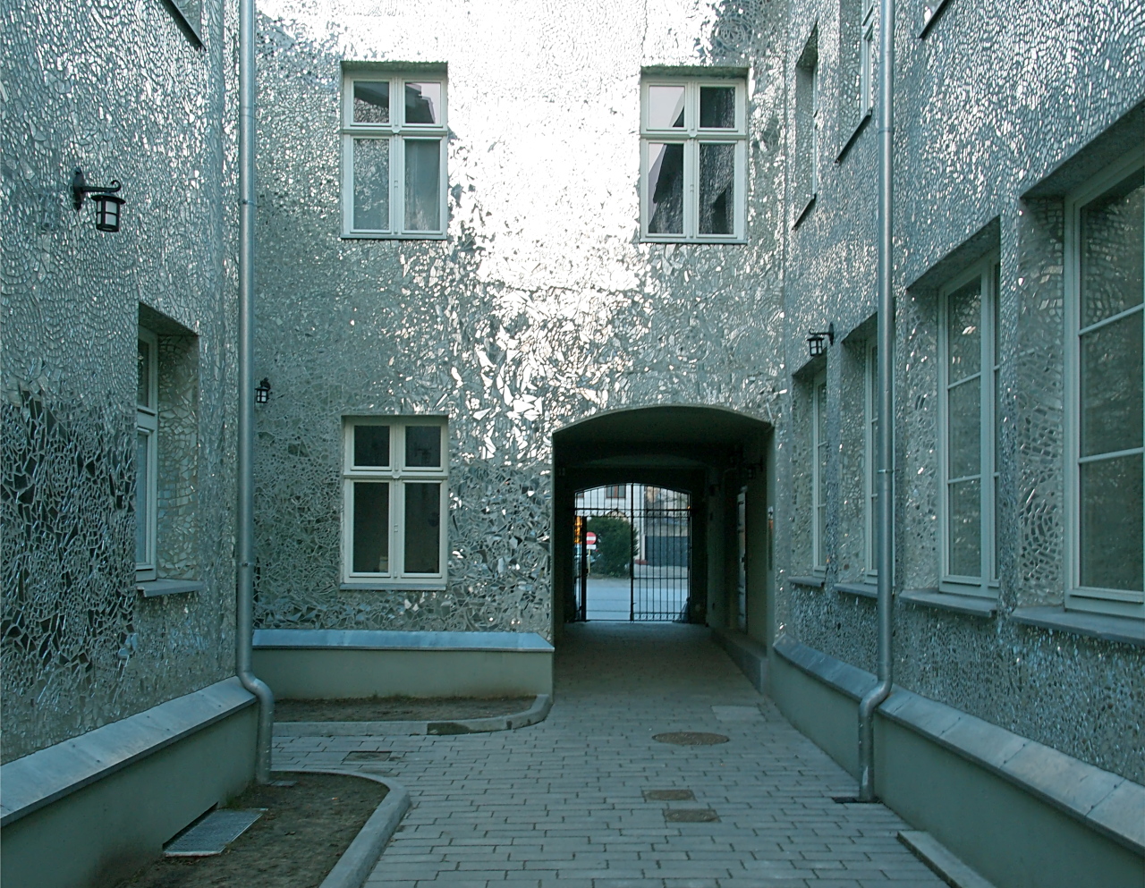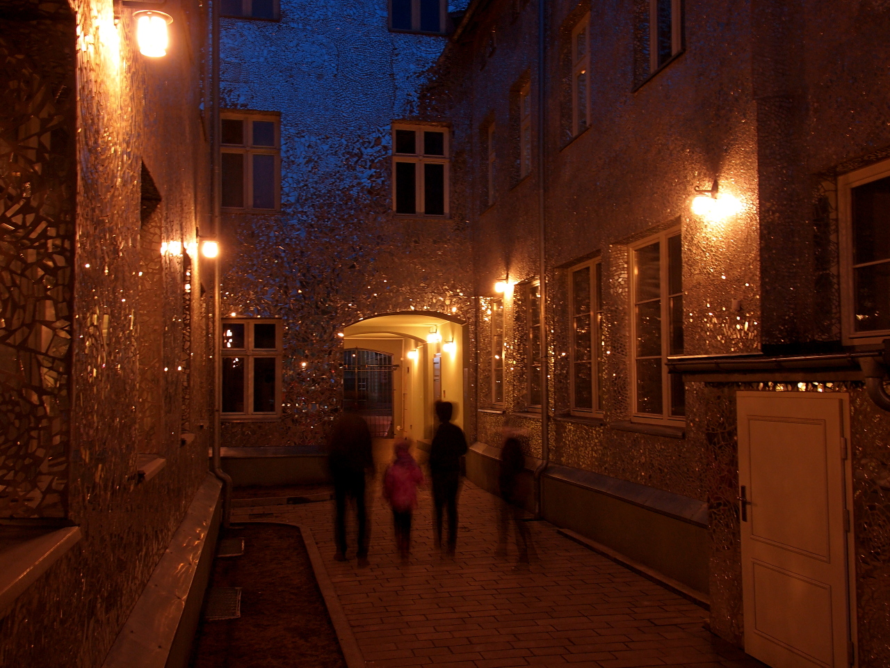 W pewnej bramie na ulicy Piotrkowskiej, pewna plastyczka ułożyła na elewacji starej kamienicy która była niegdyś(XIX wiek) hotelem, mozaikę z kawałków lusterek.