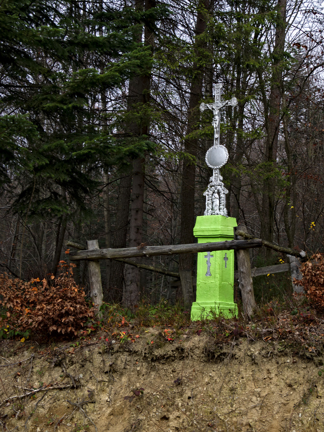 Droga na Przełęcz Majdan. Odnowiony krzyż przydrożny. To była dawniej ważna droga, co kawałek są stare dobre betonowe przepusty. Tak, tak jeszcze we wczesnym PRL-u robione.