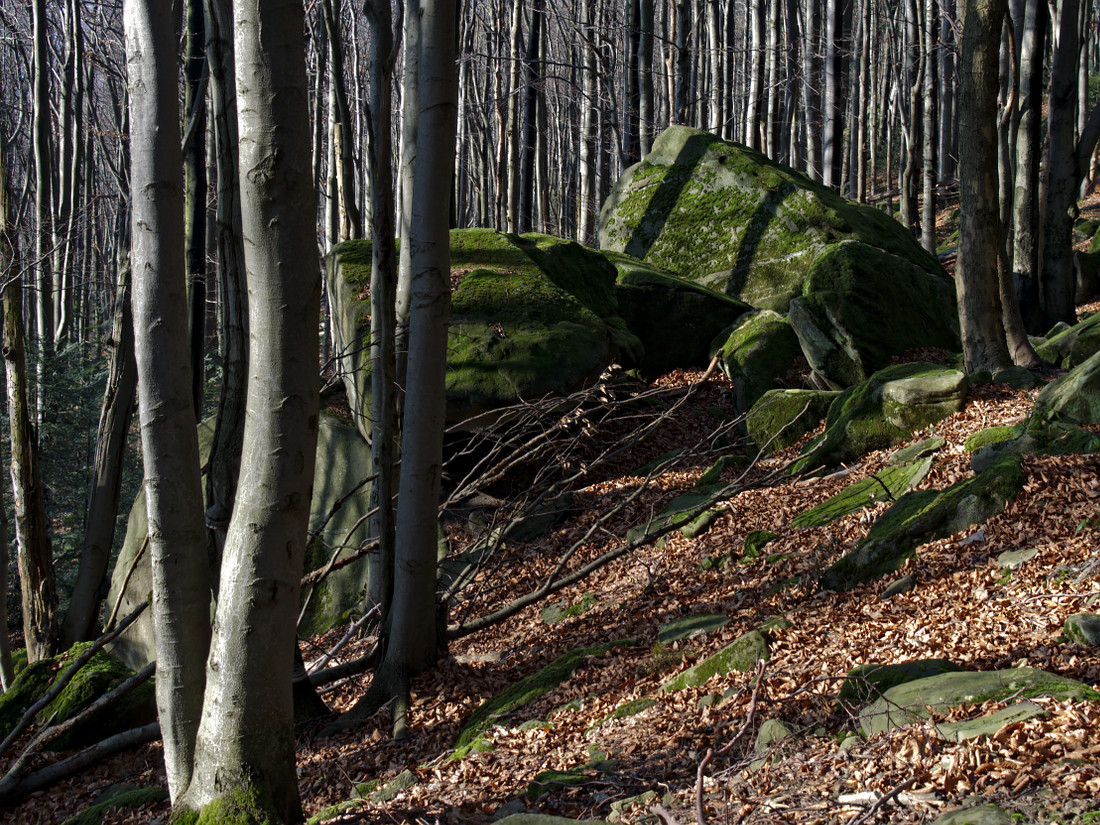 Ścieżka - szlak na 1564 idzie grzbietem wzgórza. Po lewej (od strony Bartnego) jest las modrzewiowy, po prawej (strona Folusza) jest bukowy. Trochę dalej już mamy wymieszany. Zwróćcie uwagę, że w rezerwacie skałek w większości są buki - a jest to strona Bartnego.
