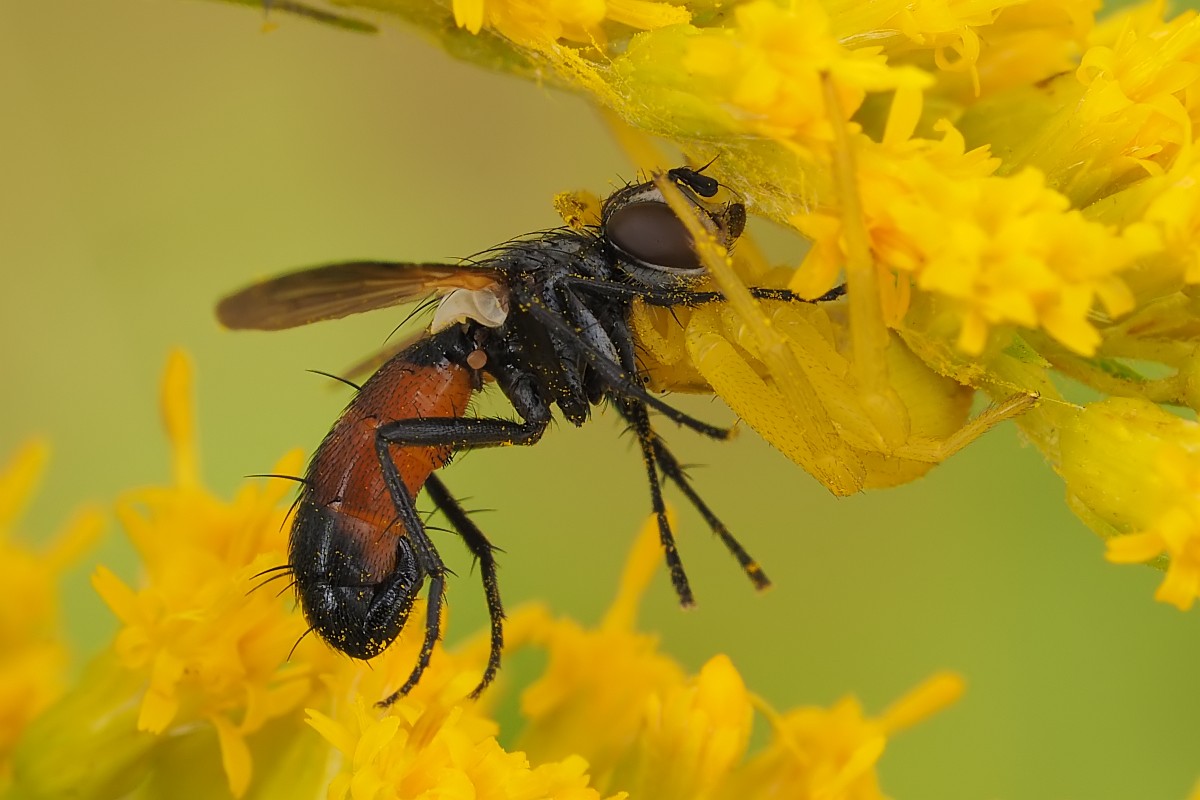 Dwa kadry kwietnika z upolowaną muchówką:
