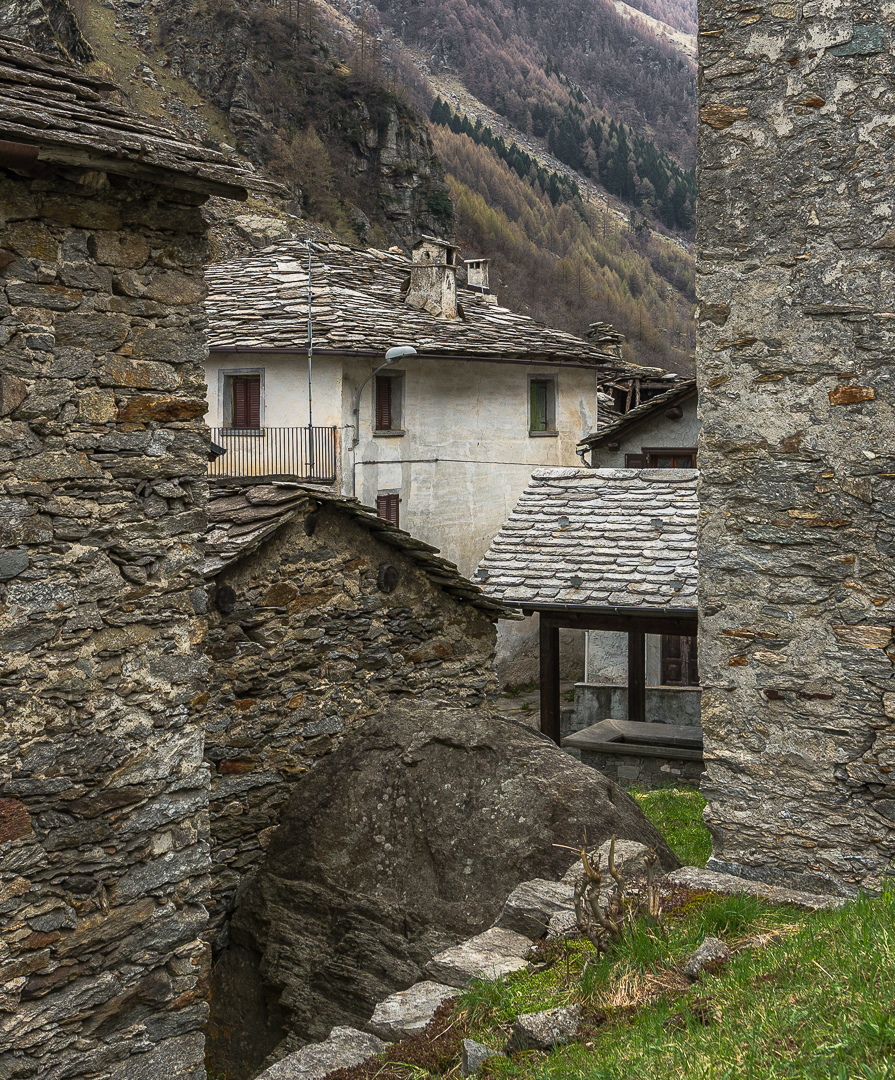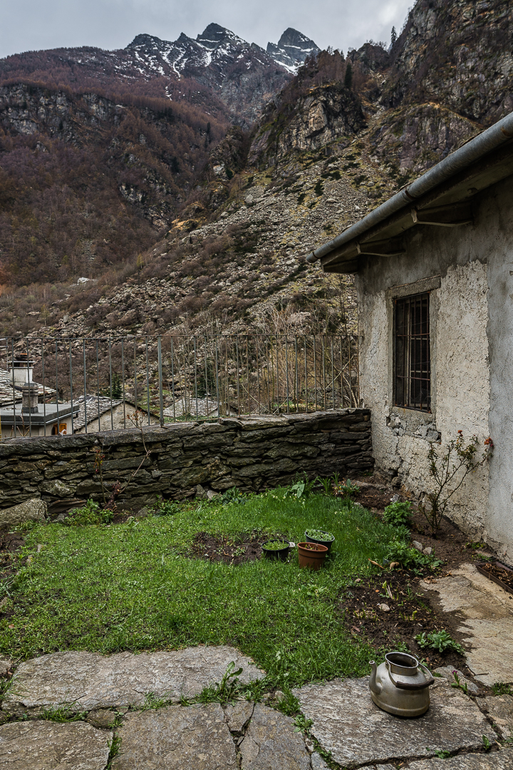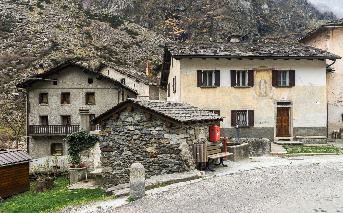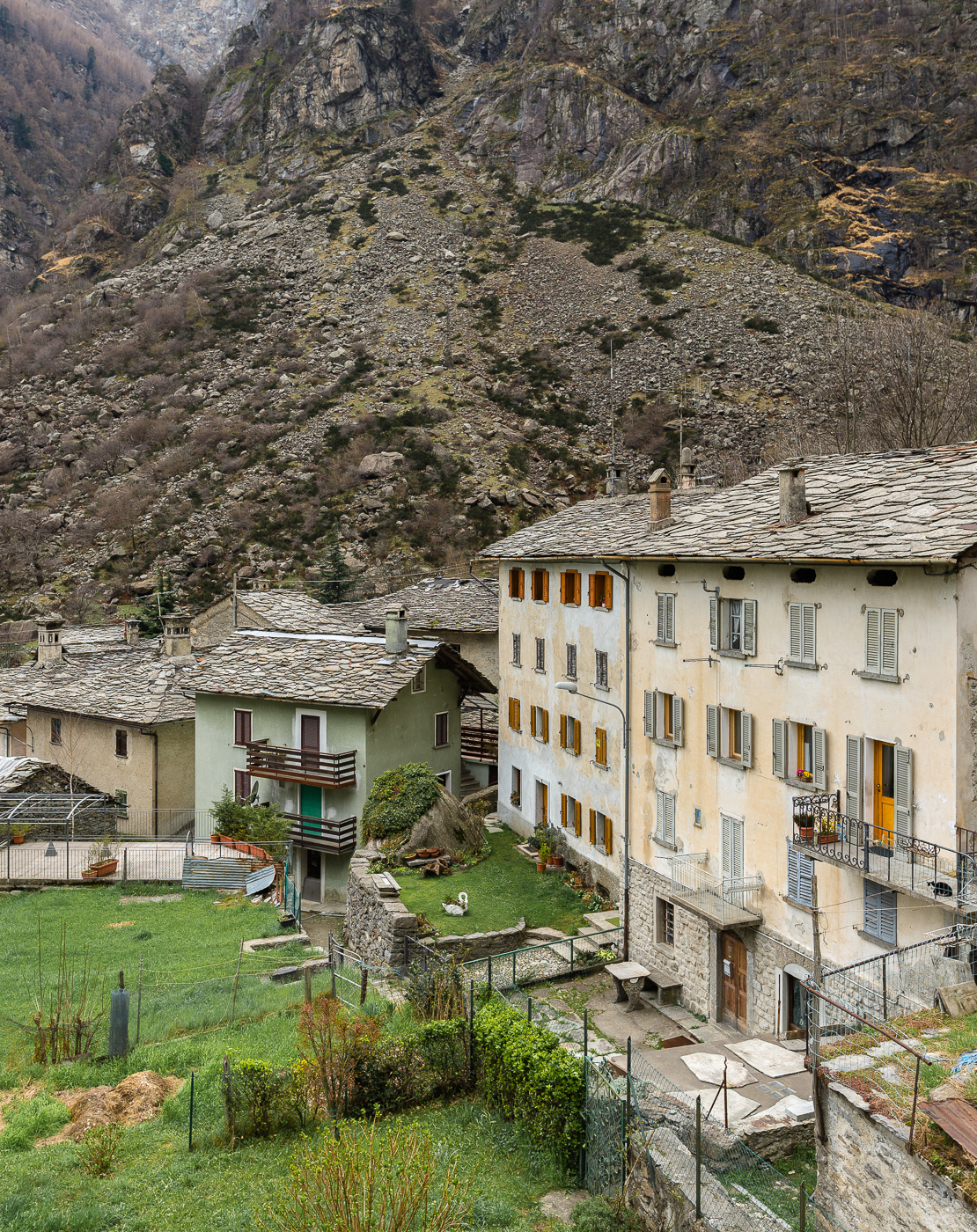 Mała osada w przedwiosennej scenerii. Wciśnięta w zbocza alpejskich zboczy na północ od jeziora Lago di Mezzola.