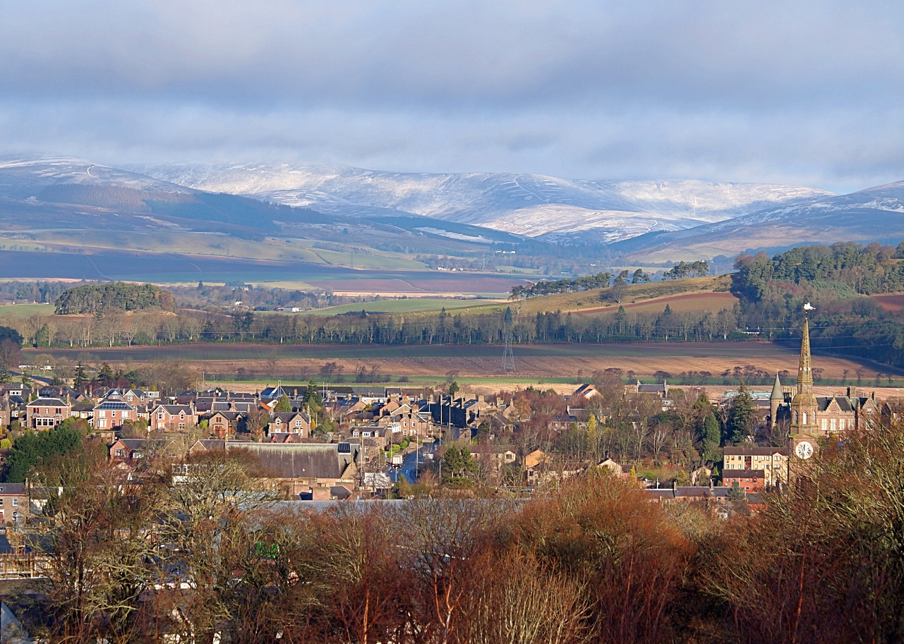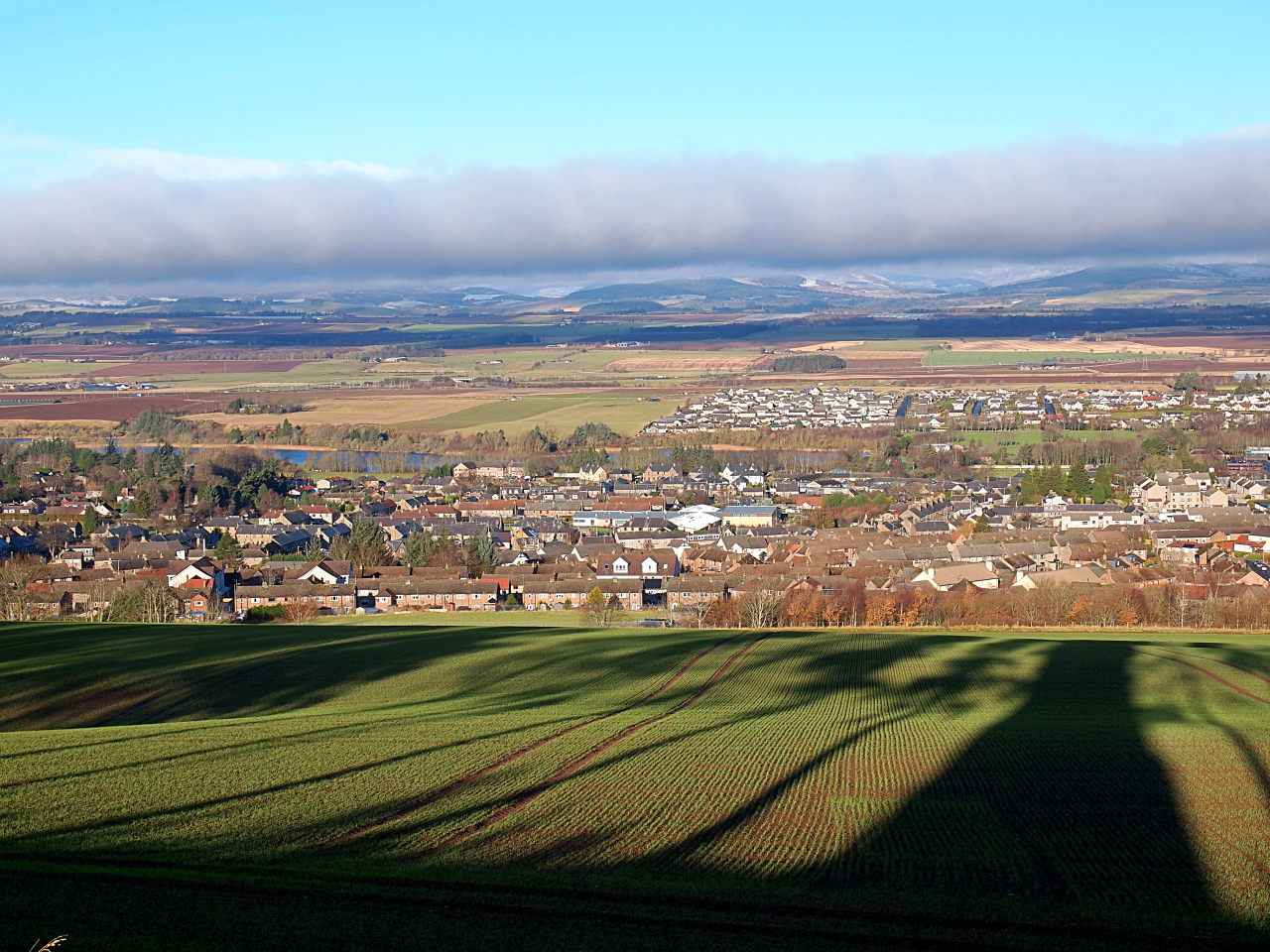 Widok ze wzgórza nad miatem Forfar, może nie rzuca na kolana, ale to zależy od pogody, która okoliczne wzniesienia potrafi pięknie uszlachetnić swoją naturą.