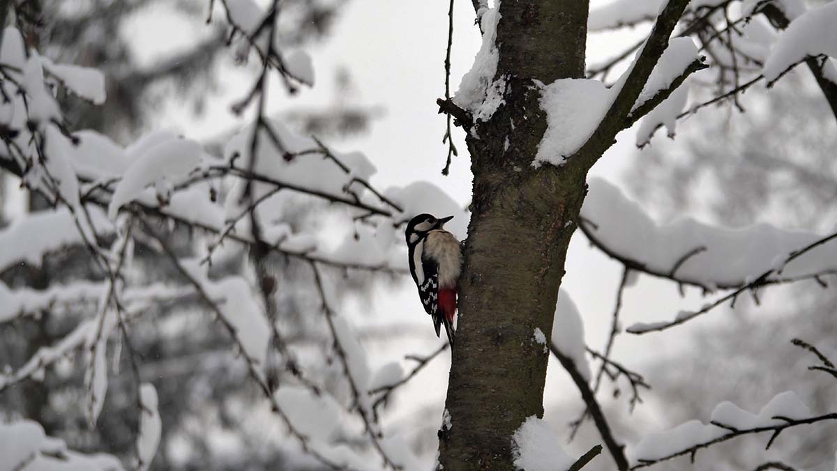 Dzięcioł i sikorki strzelany przez okienną szybę też z 300-ki.