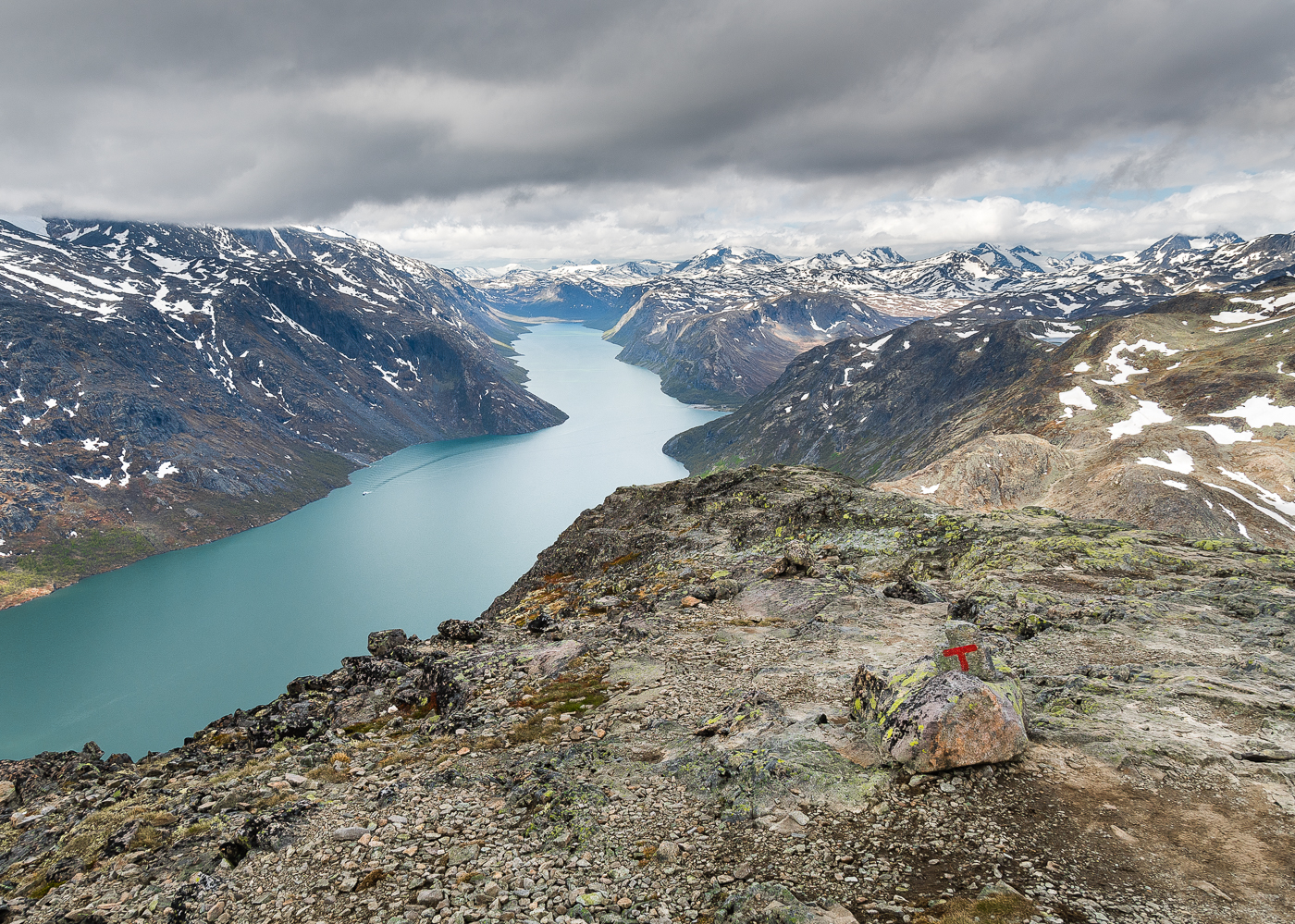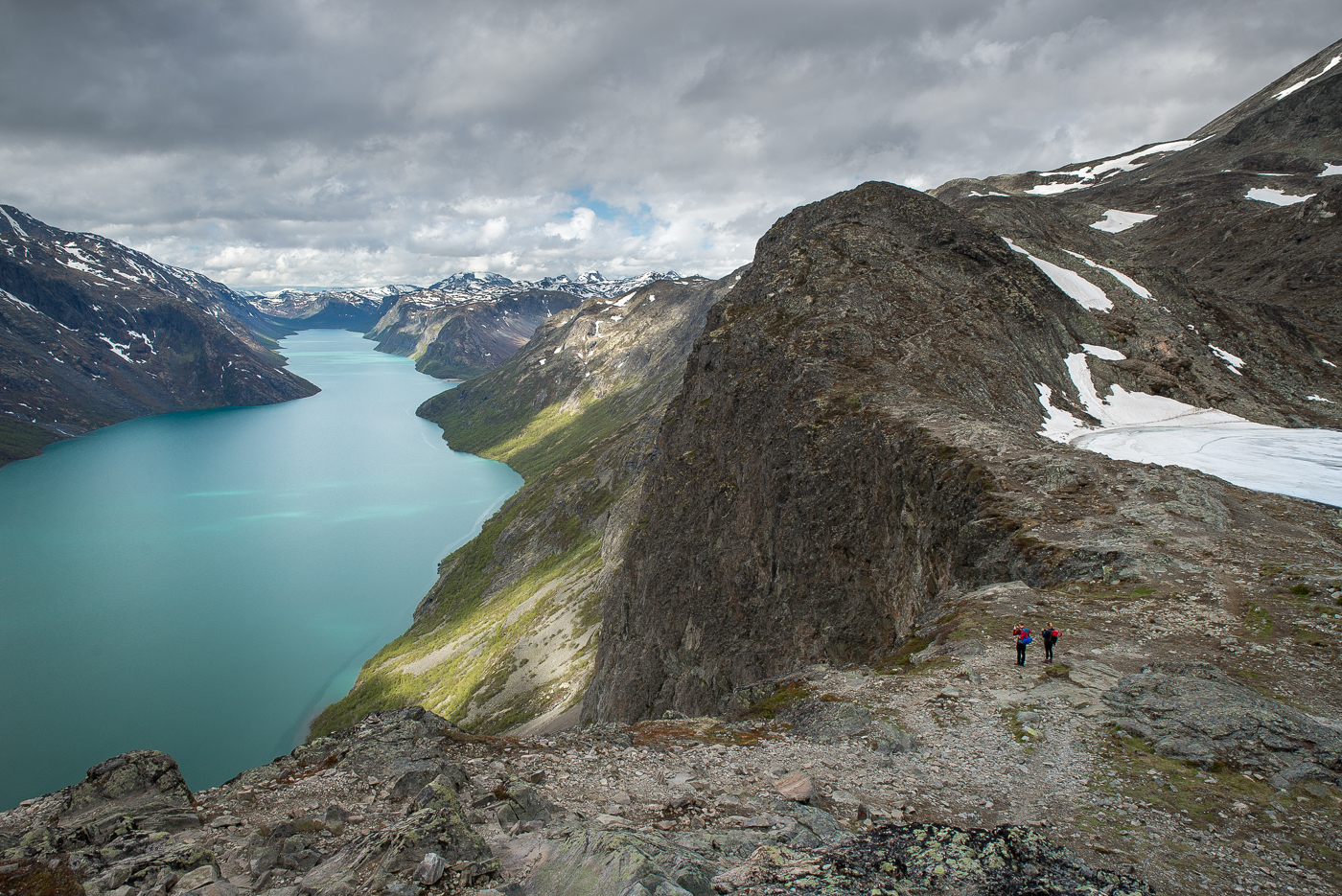 Miałem też szczęście trafić na moment. kiedy górne Bessevatnet jest zamarznięte, a dolne leżące 400 metrów niżej Gjendevatnet mieni się swoimi naturalnymi kolorami. Wycieczki poza sezonem mają plusu ujemne... jest zimno i może być ślisko :). Dodatkowo, schodząc czy podchodząc, trzeba wzmóc czujność przy krawędzi urwiska. Nieoczekiwany silny szkwał może spowodować, że się bardzo zdziwimy wykonując swój ostatni lot....