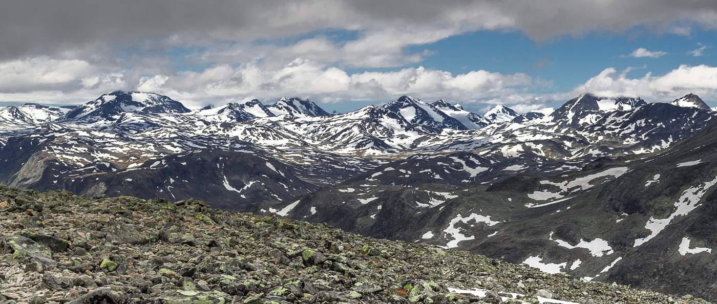 Widok na najwyższe pasmo Jotunheimen z szczytami Galdhoppigen,Glittertind i innymi godnymi podziwiania i zdobywania.