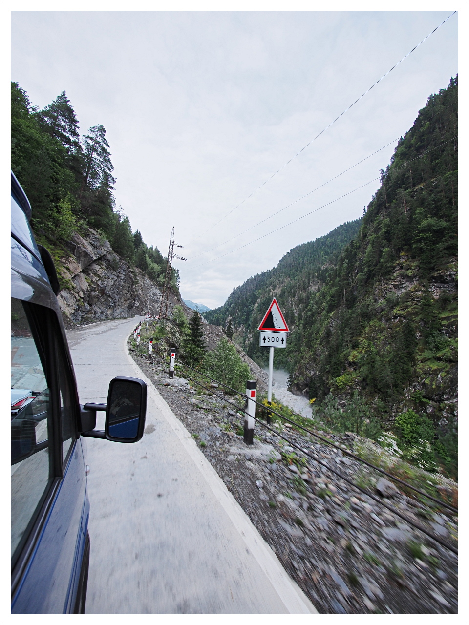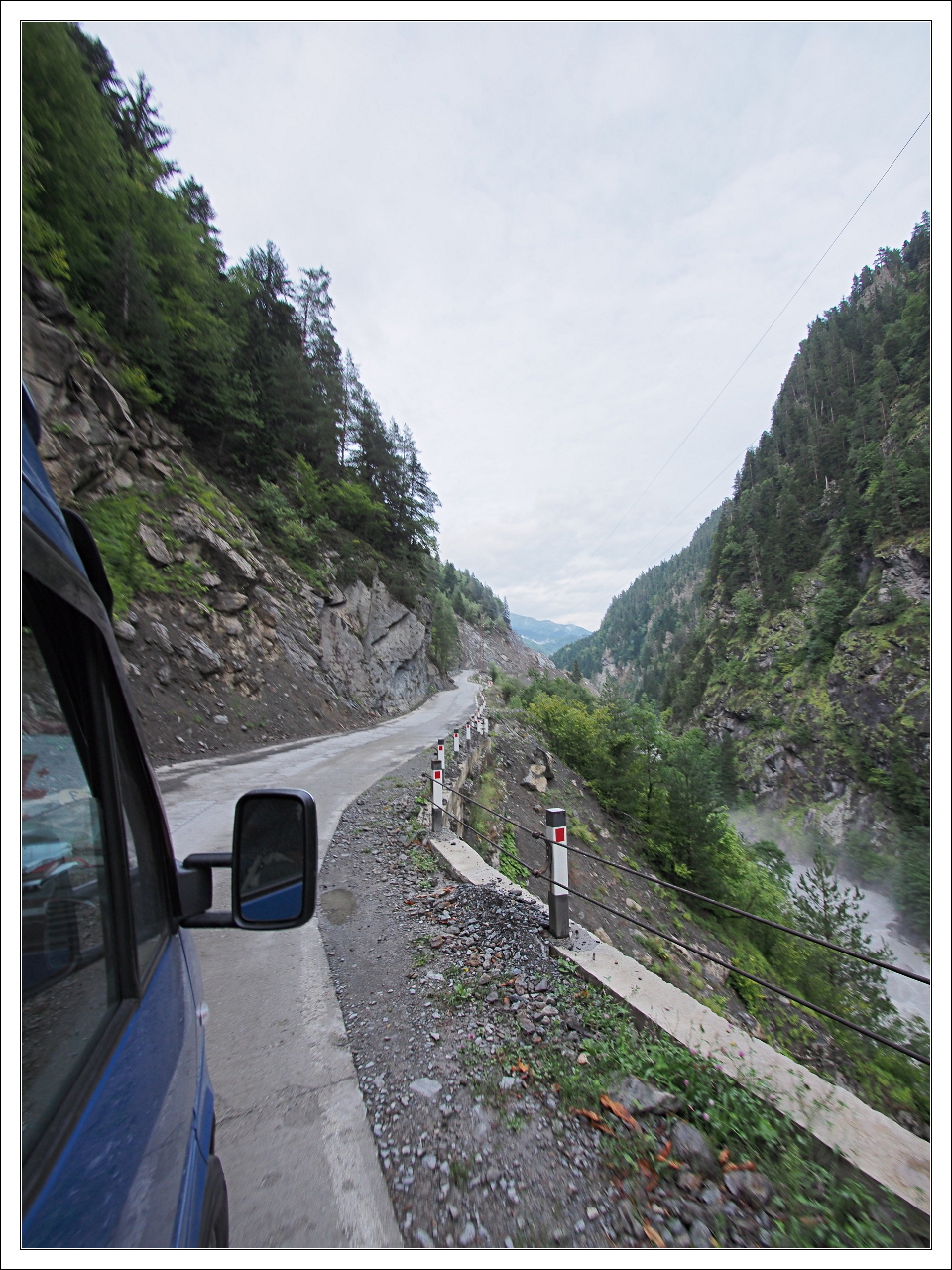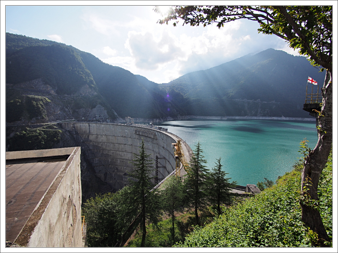 Jedziemy w góry. Trasa z Zugdidi do Mestii, początkowo łagodna szybko nabiera cech typowych dla drogi górskiej. Po lewej stronie mijamy zaporę i elektrownię wodną na rzece Inguri. Na "naszym" brzegu powiewa flaga Gruzji, na drugim pewnie też coś powiewa ale tam jest już zbuntowana Abchazja.
