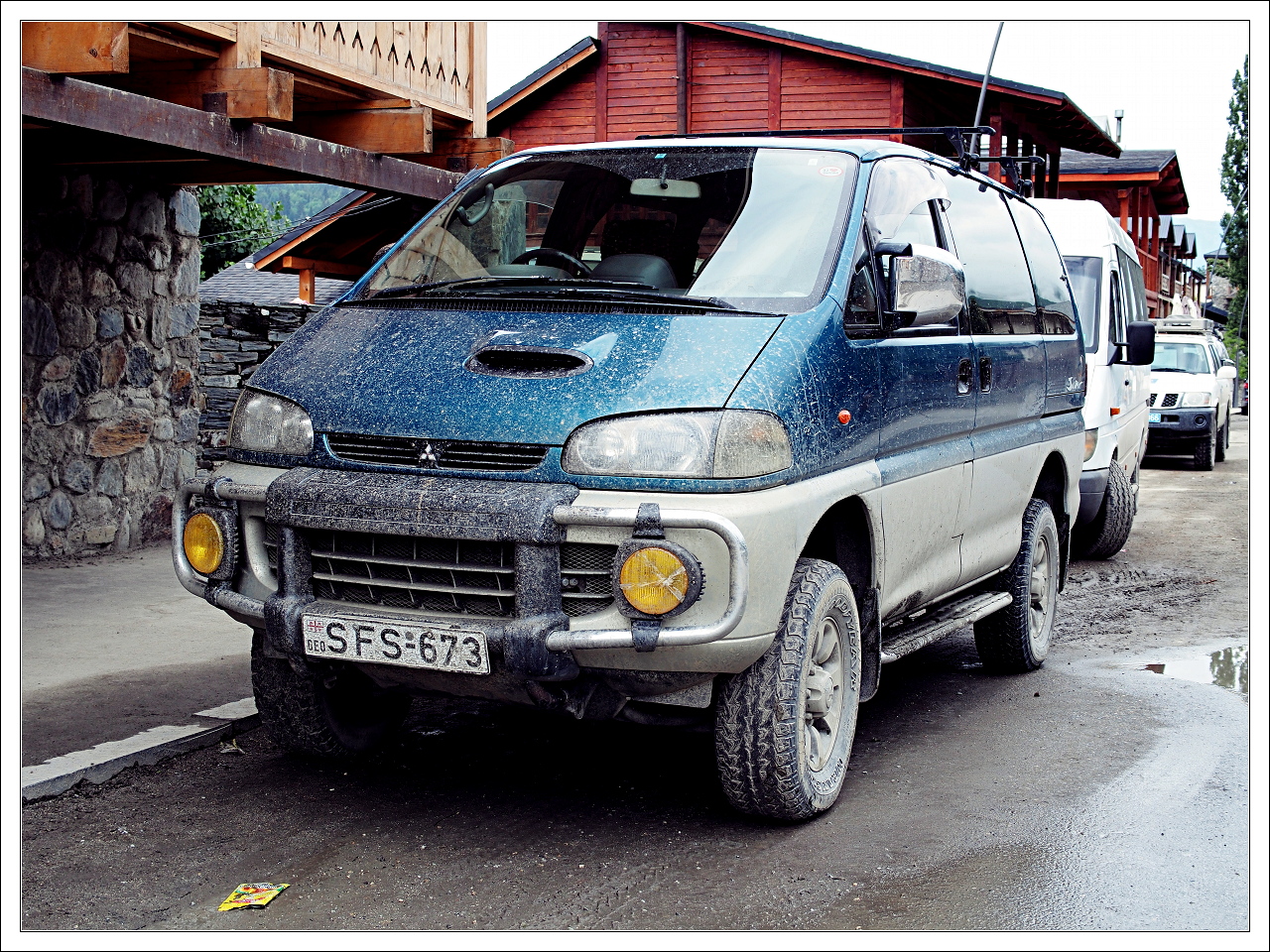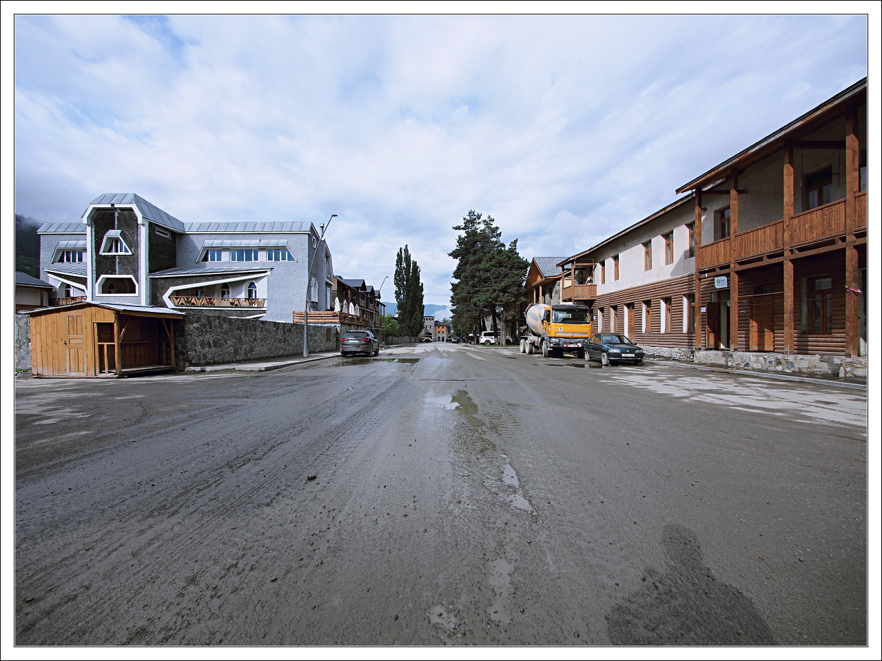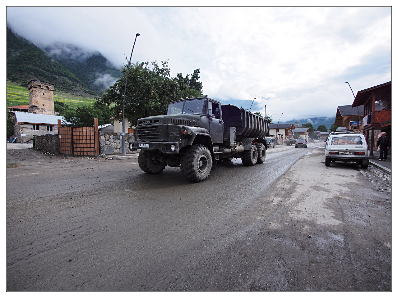Przy której codziennie rano stoją małe, czteronapędowe busiki czekające na turystów udających się do Uszguli czy pod lodowiec.