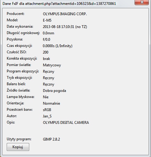 Miałem kiedyś obydwie zainstalowane. Gdzieś tam po aktualizacjach Firefoxa Exif Viewer mi zaginał. Ale masz racje, zainstalowałem ponownie Exif Viewer i ten pokazuje poprawnie. Wolałem jak dotąd ewentualnie podglądać tym FxIf. Podaje podstawowe i wystarczające informacje. Exif Viewer za dużo zbędnych wyświetla moim zdaniem choć będę musiał starać sie weryfikować jednym i drugim jak widać...