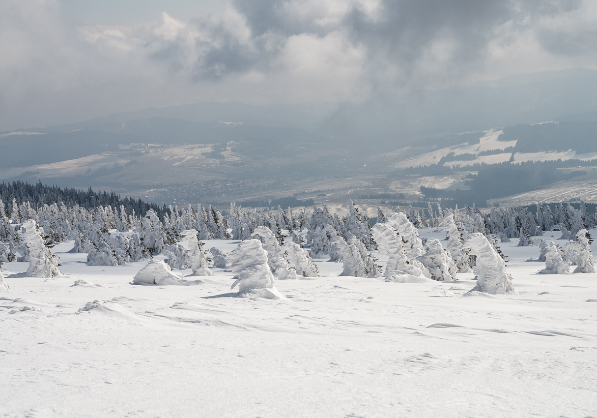 Piękne zimowe górskie klimaty. Te śnieżne "rzeźby" wyglądają jak ktoś zmroził chmury i osadził je na szczytach.