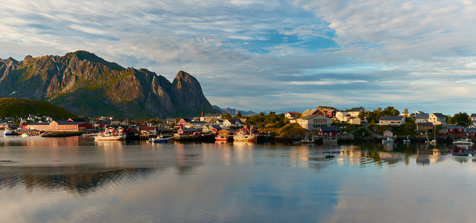 Reine w oddali za wodą, potężne skały obok, smużące odbicia w wodzie i niebo przyjaźnie błękitne z welonkiem chmur. Wyjątkowo malownicze, inspiruje wyobraźnię.