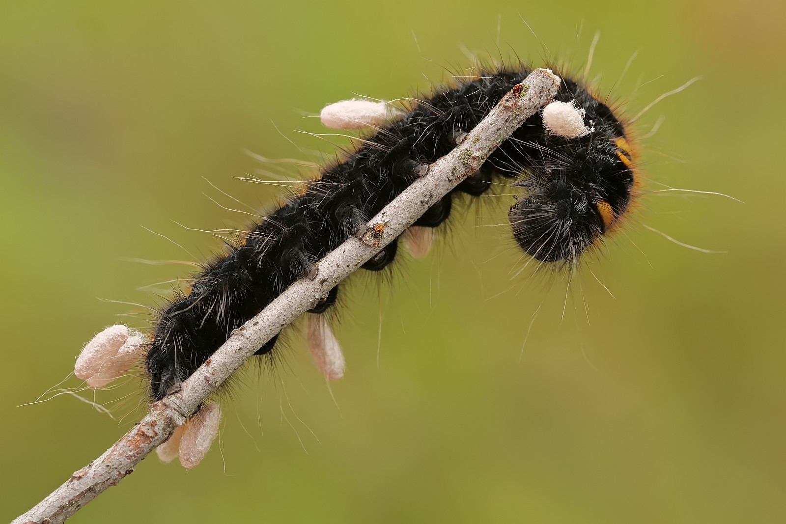 Gąsienica z kokonami pasożytów, które wykarmiła. Larwy pasożytów żyły w ciele gąsienicy wyjadając ją od środka, po czym wygryzły się na zewnątrz i przepoczwarczyły się w zbudowanych przez siebie kokonach. Zadziwiające jest to, ze gąsienica po takich przejściach nadal żyje, aczkolwiek nie sądzę by była jeszcze zdolna do normalnego przepoczwarczenia: