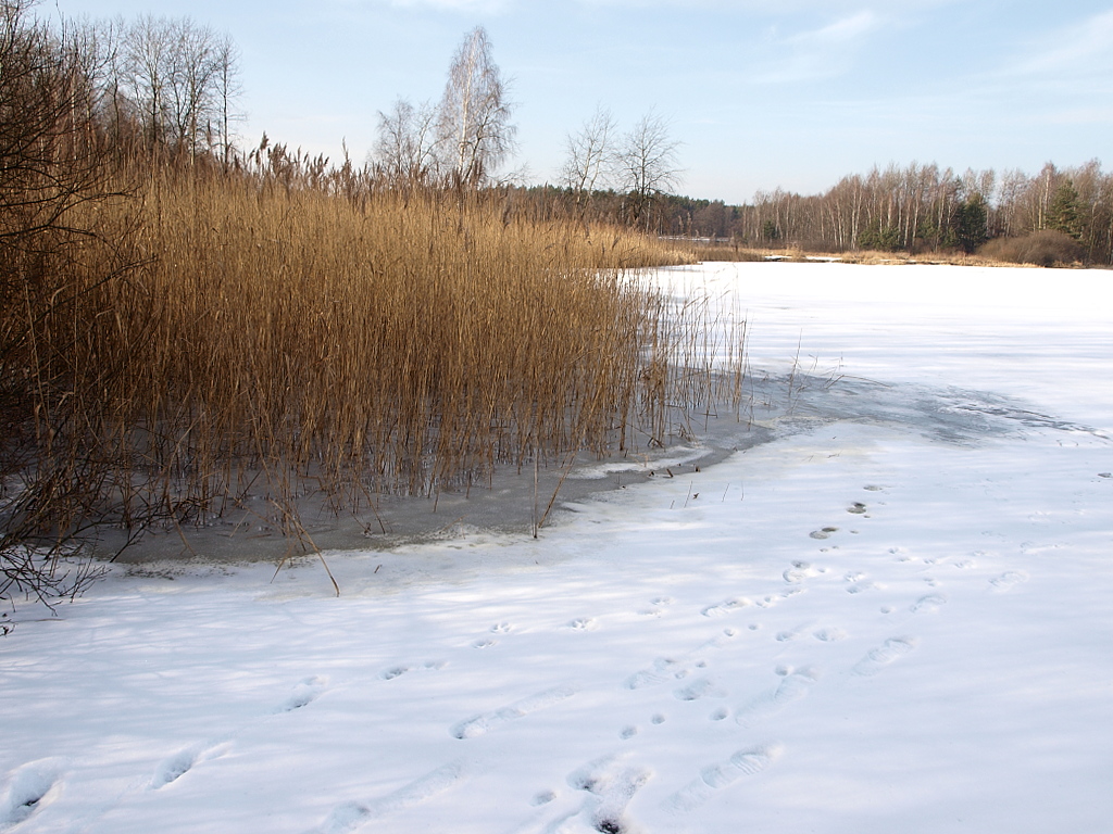 Tutaj już śnieg topnieje. Troszkę bałem się wchodzić tutaj, ale po zbadaniu nogą lodu okazało się że jest on jeszcze dość mocny. Ślady te które widać zostawił ktoś inny . Ja aż taki odważny nie byłem aby podchodzić tak blisko .