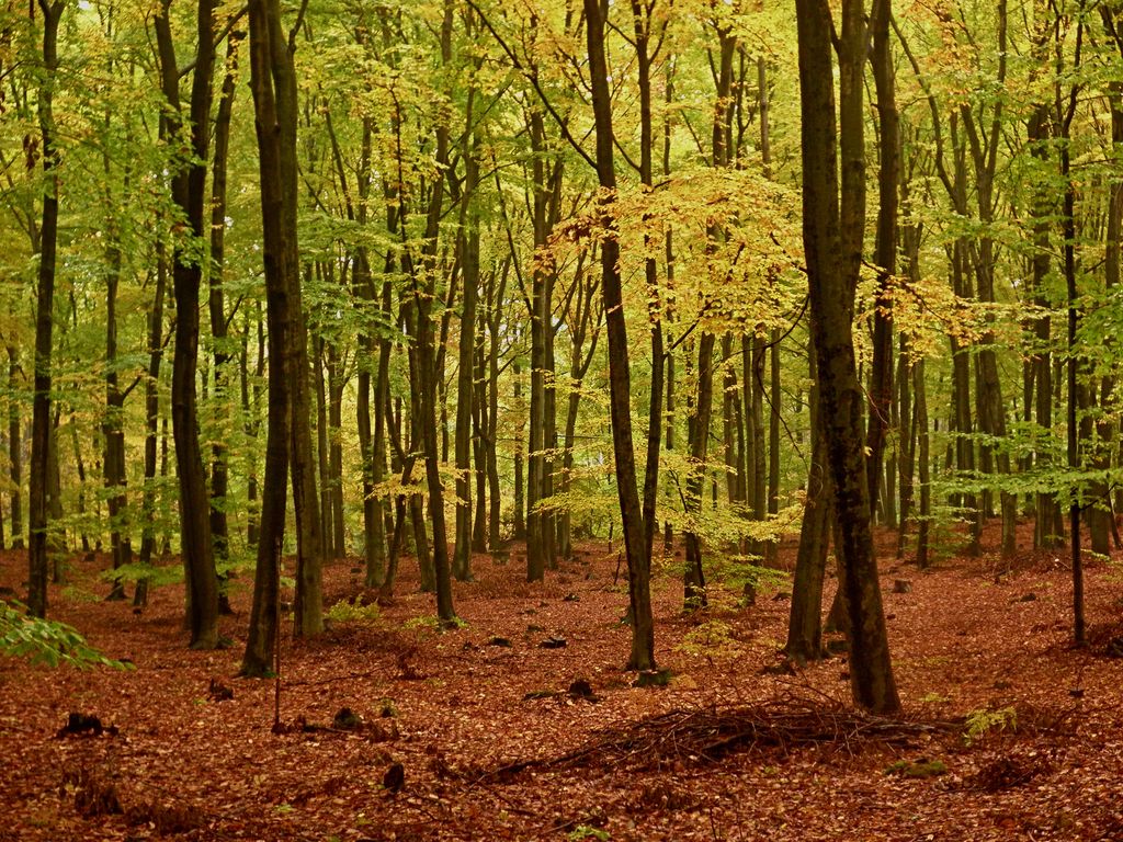 Poranek w w lesie lisciasty,gdzie pieknie zolte gra z zielonym.