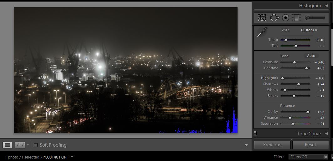 Dźwigi mocno clarity na +, defog też, oziębienie i nasycenie na -, prześwietlenia na -, cienie lekko na +. Reszta to walka z kontrastem. Lekko odszumioine.