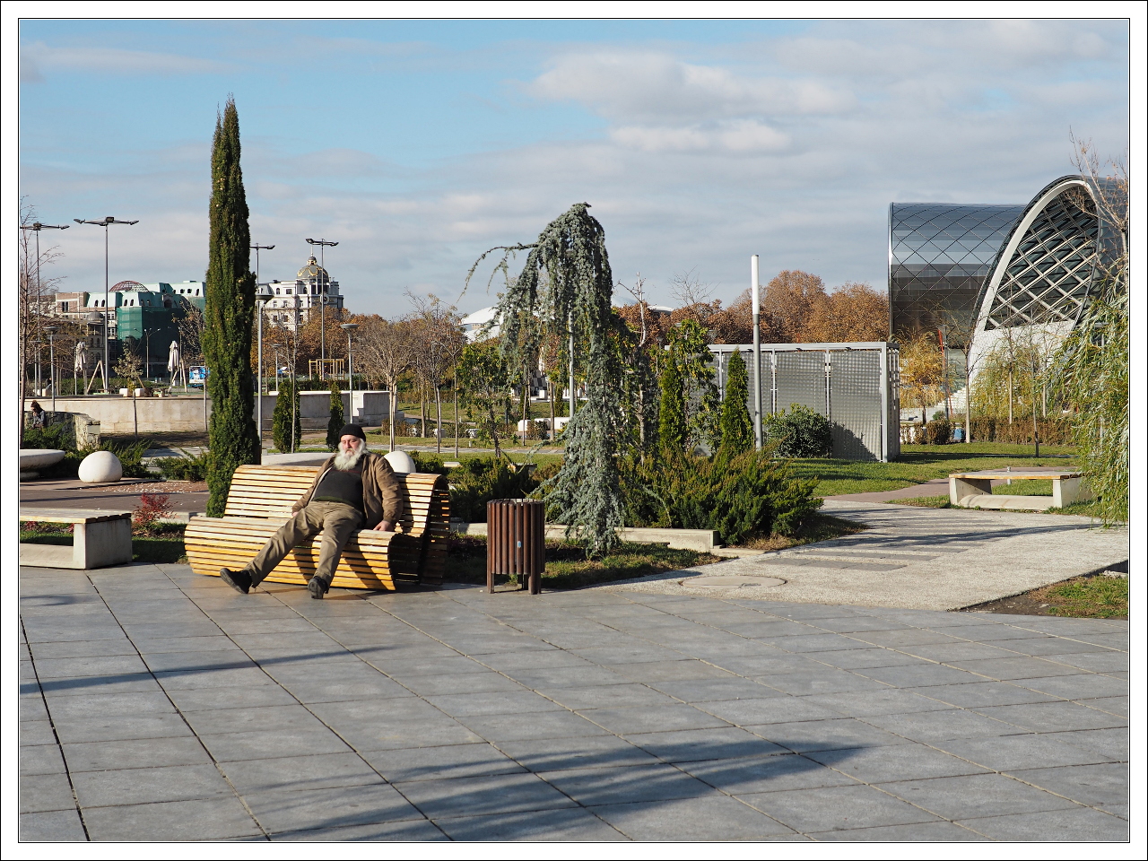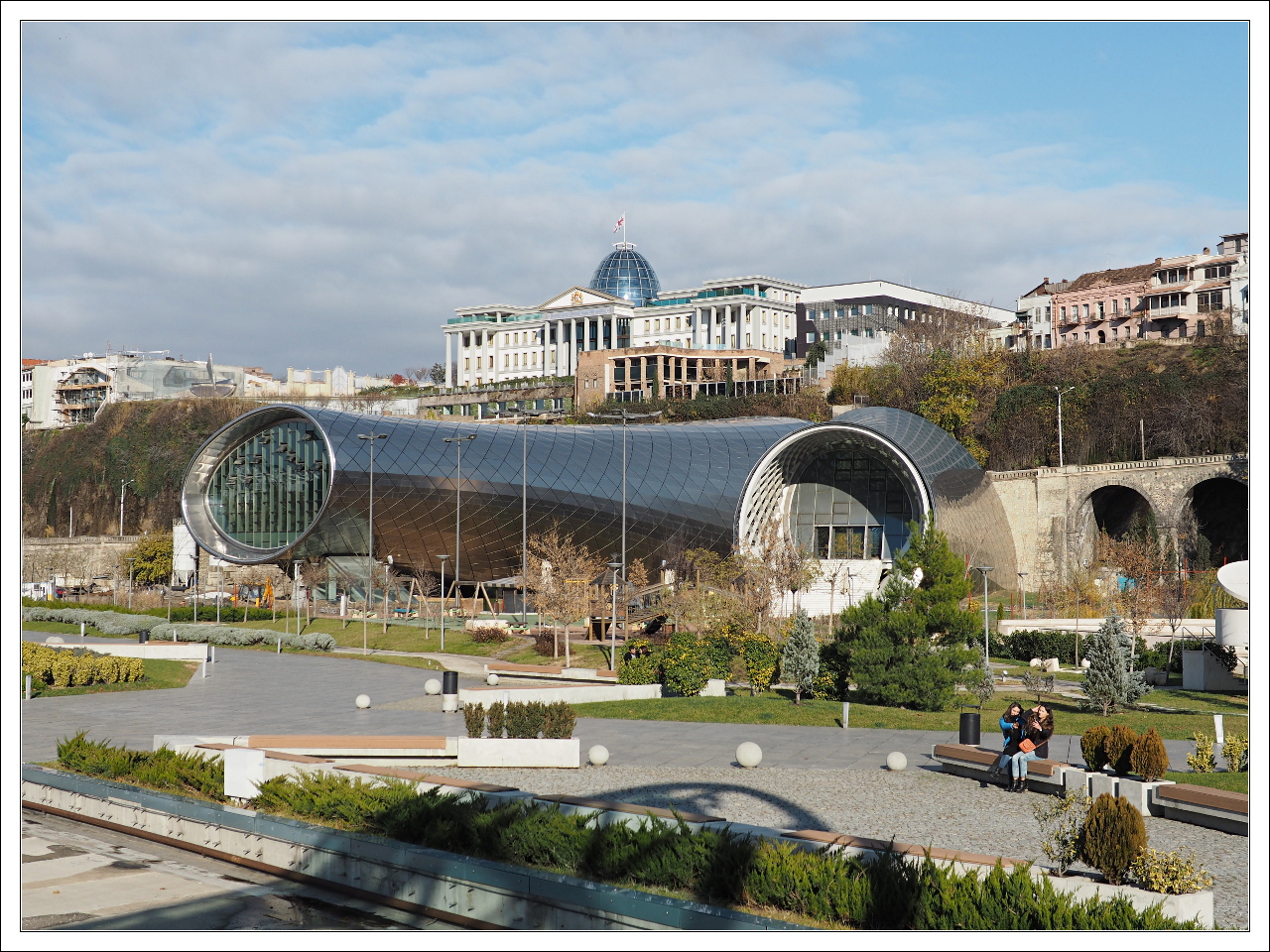 A potem parę kroków i jesteśmy na Kładce Pokoju gdzie z jednej strony można spojrzeć na cerkiew Metechi, tę z poprzedniego odcinka, a z drugiej widać jak na dłoni Pałac Prezydencki i budowę Sali Koncertowej vel Opery.