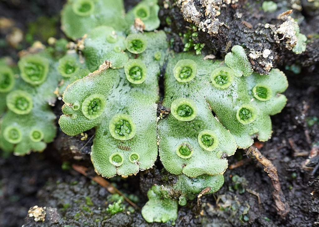 164. Porostnica wielokształtna (Marchantia polymorpha) - wątrobowiec. Na zdjęciu widoczne zbiorniczki z rozmnóżkami (zwane też kupulami) na gametoficie (plecha). Gametofitów nie widziałem - trzeba będzie poobserwować czy coś się zmienia.