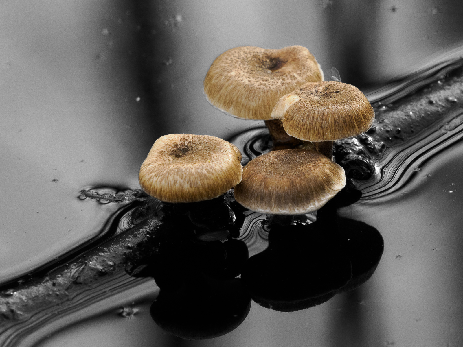 Okazały grzyb rosnący na pniu ściętej sosny. Stack z 10 klatek. Gatunku niestety nie znam: