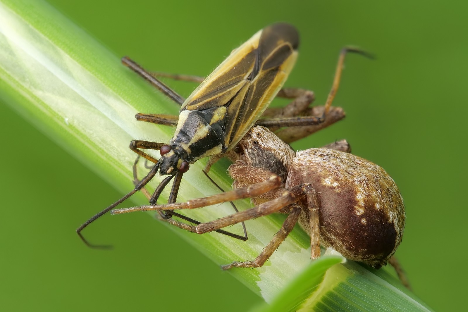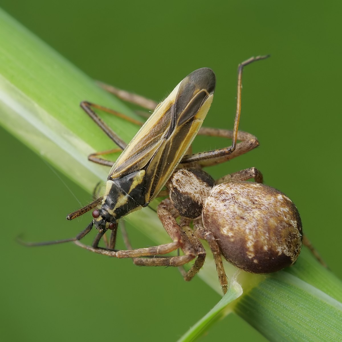 Posiłek podłużnika. Daniem jest jakiś mniejszy od niego pająk: