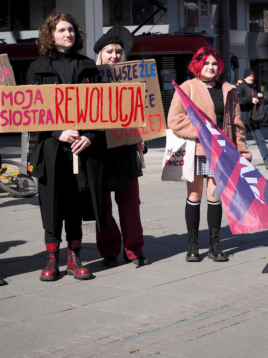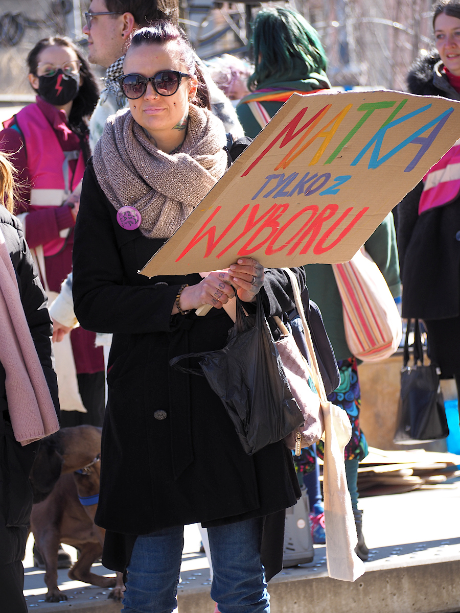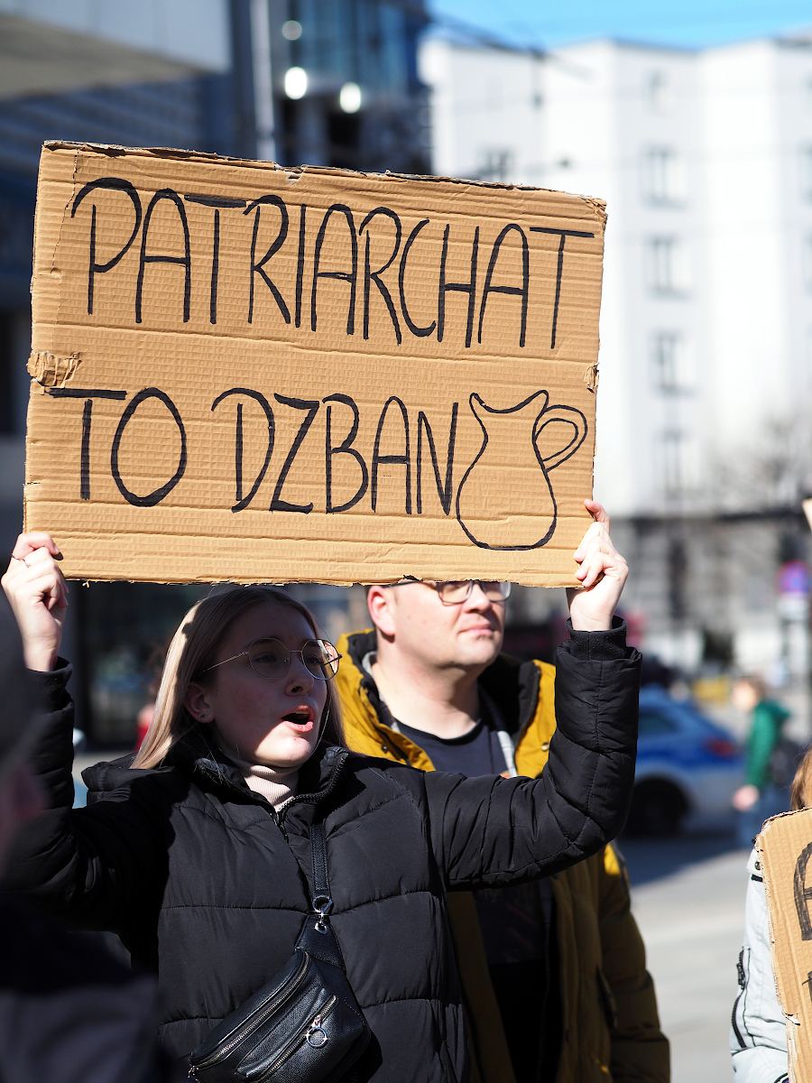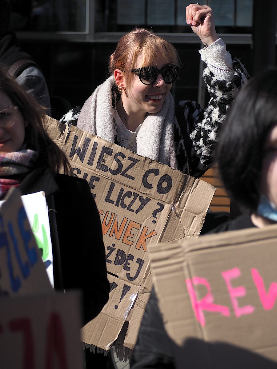Fajny jest portret idącej w górę schodów pani z tabliczką "Seks tak, seksizm nie". Mimo poręczy w tle.