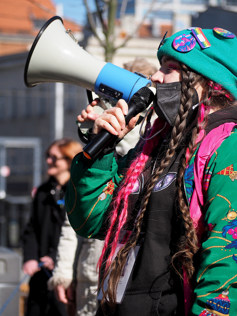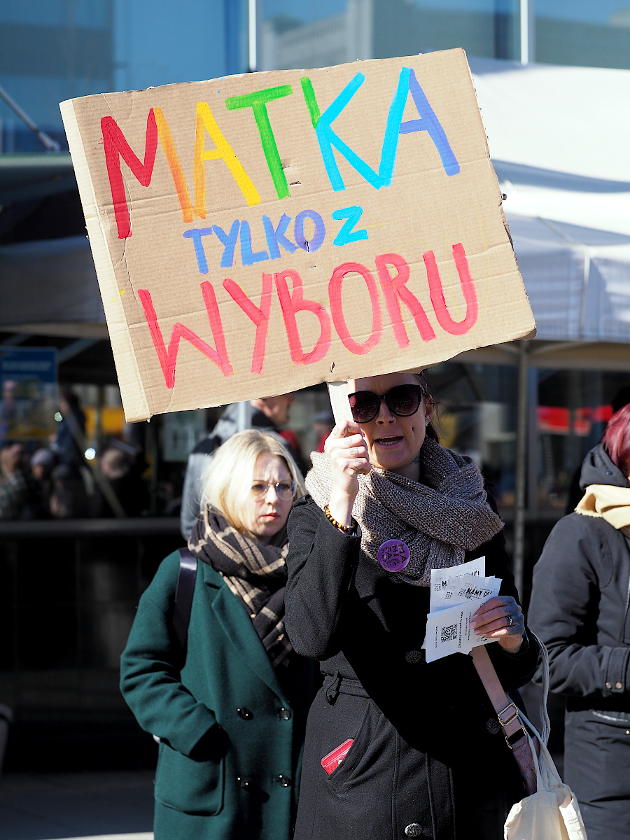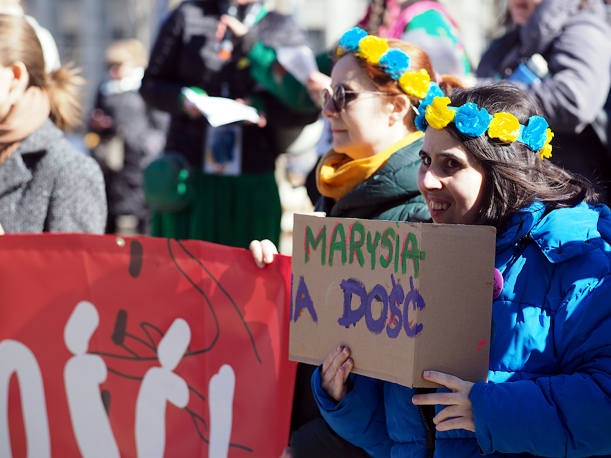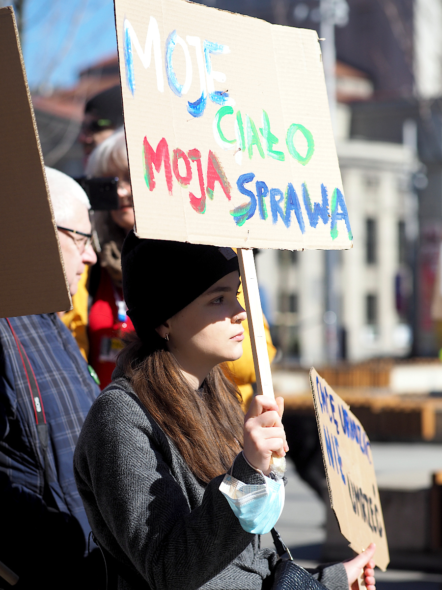 Fajny jest portret idącej w górę schodów pani z tabliczką "Seks tak, seksizm nie". Mimo poręczy w tle.