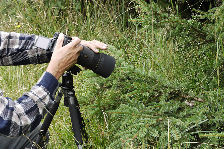 Tak wiec w wielu aspektach postępuję przeciwnie do zaleceń innych makrofotografów. Każdy pracuje jak mu najwygodniej. Są tacy, którzy "lubią" leżeć na mokrym torfowisku czy wręcz w błocie, a ja siedzę wtedy na stołeczku wędkarskim, nawet na łace czy w suchym lesie. Wyjątkowo używam ogrodniczych nakolanników. Wygoda na pierwszym miejscu, ale nigdy nikomu nie zalecałem fotografowania po mojemu; każdy musi to sam dopracować.