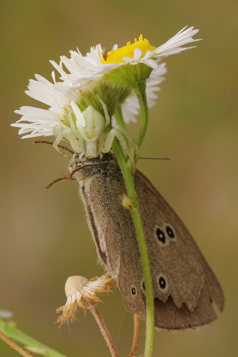 Zażartka mrówkowata pożywia się schwytanym pluskwiakiem. A małe muszki z rodziny Milichidae kręcą się niecierpliwie czekając na swoją kolej do uczty: