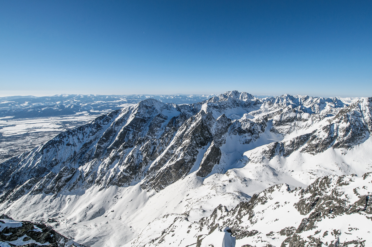 Chata Teryho i Kotlina Pięciu Stawów Spiskich widziana z Łomnicy - wersja zimowa.