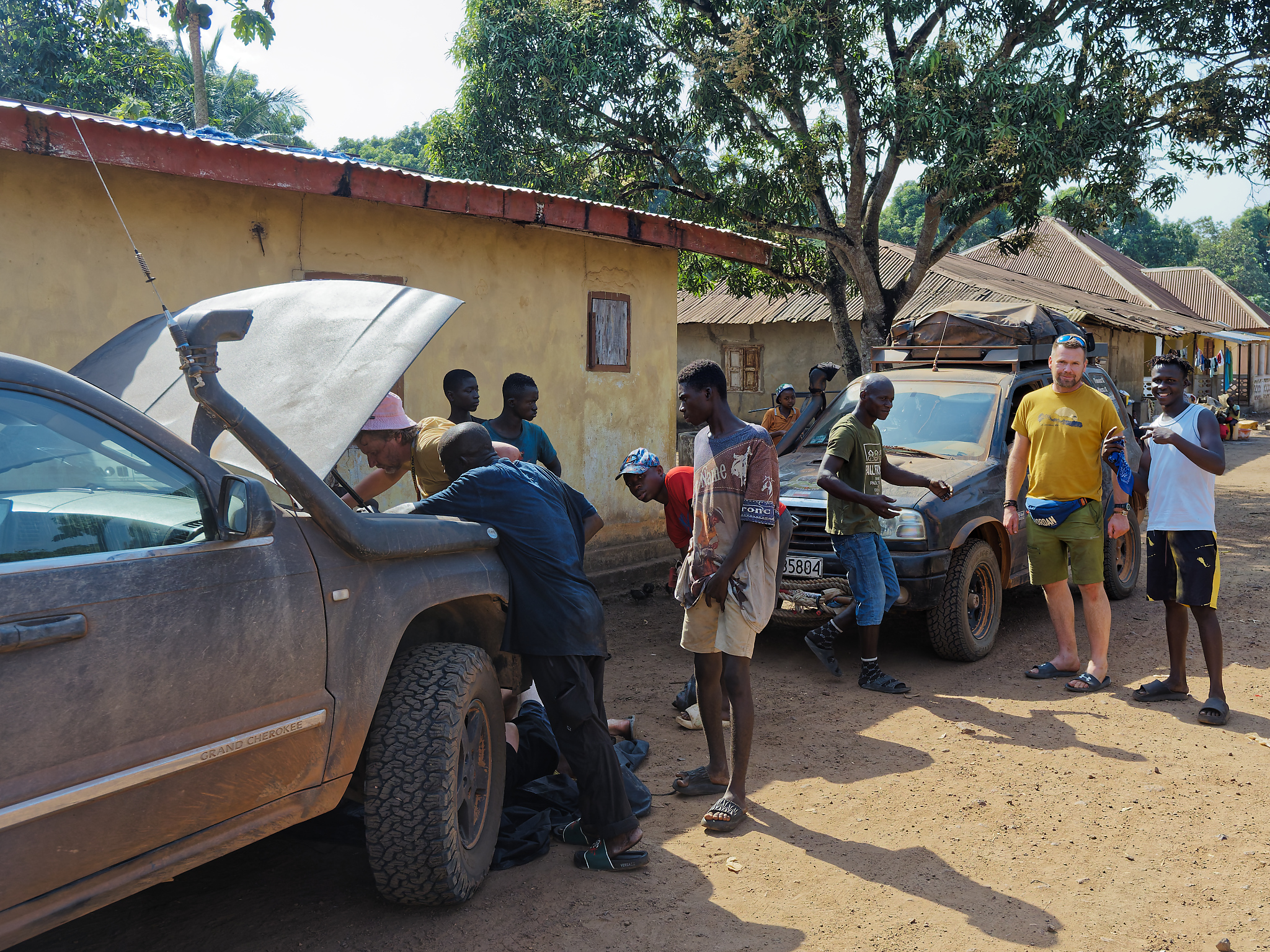 Na szczęście znajdowaliśmy się z jakiejś niewielkiem miejscowości a tam wszędzie są warsztaty samochodowe, głównie ze względu na stan dróg choć drogi w Sierra Leone w porównaniu do Gwinei to normalnie autostrady równe jak stół. W każdym razie mieliśmy od razu mnóstwo pomagierow no i znalazł się jakiś mechanik od którego kupiliśmy 4 paski na zapas aby tylko dojechać :) Co prawda nie były 7 rowkowe a 6 ale przynajmniej długość byla poprawna.