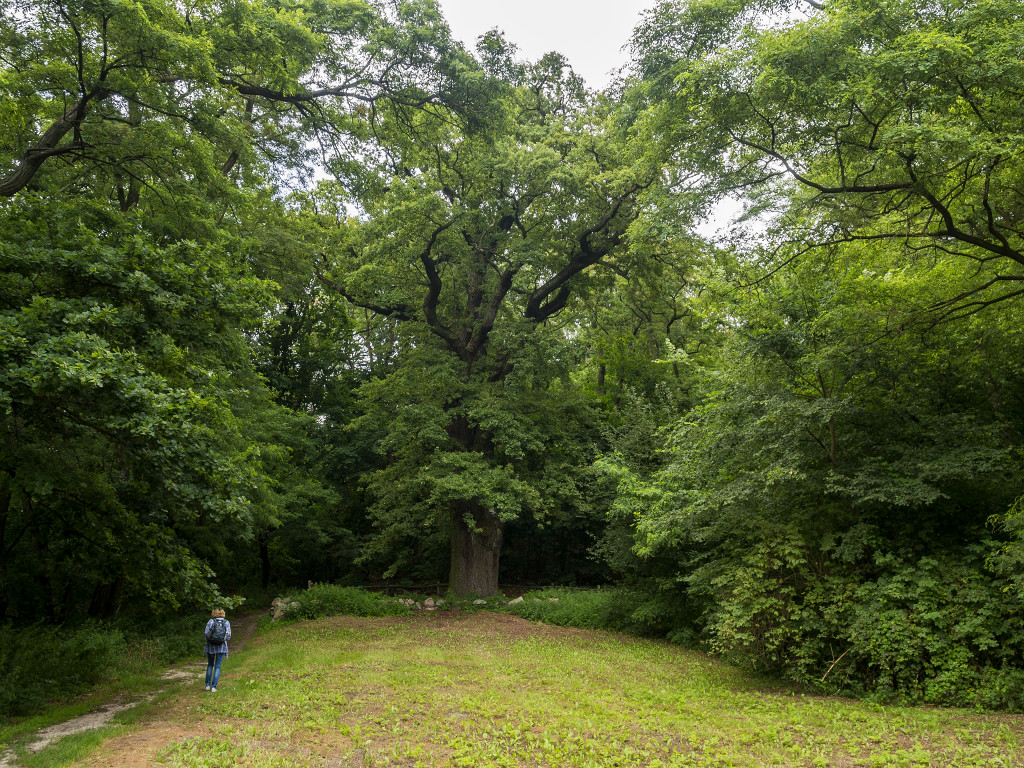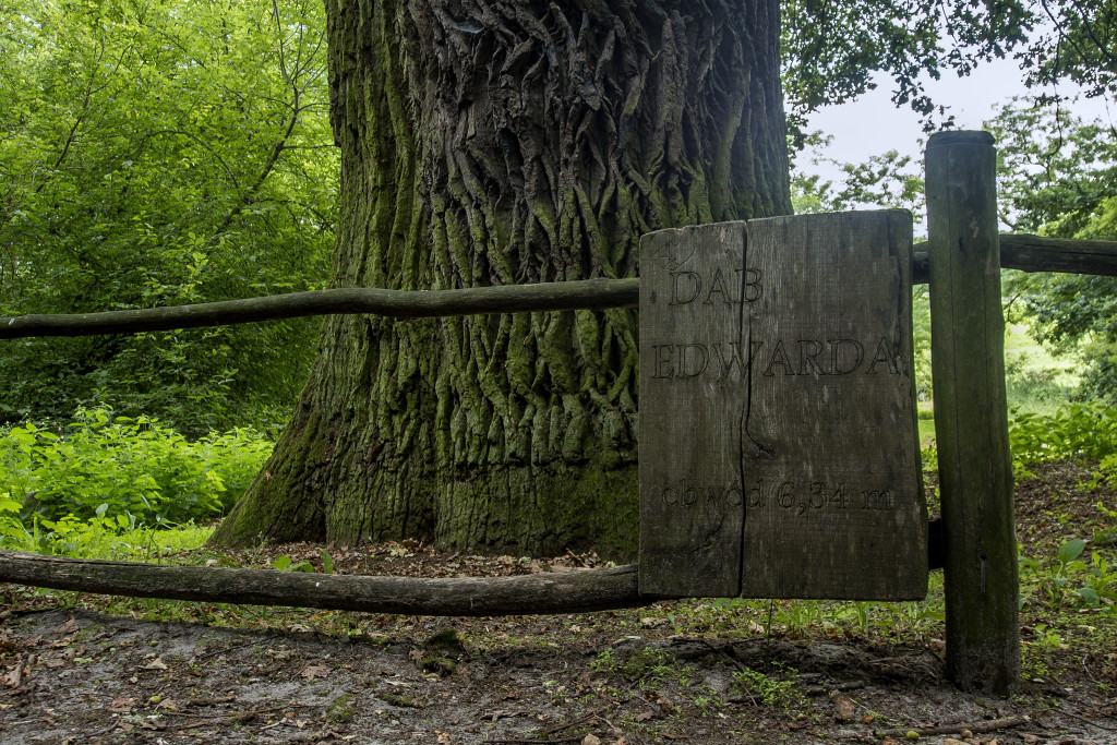 o obwodach 635, 726 i 926 cm oraz "Edward" o obwodzie 650 cm rosnący na jego skraju, na zboczu doliny Warty. Dęby po raz pierwszy policzono w 1904 r.