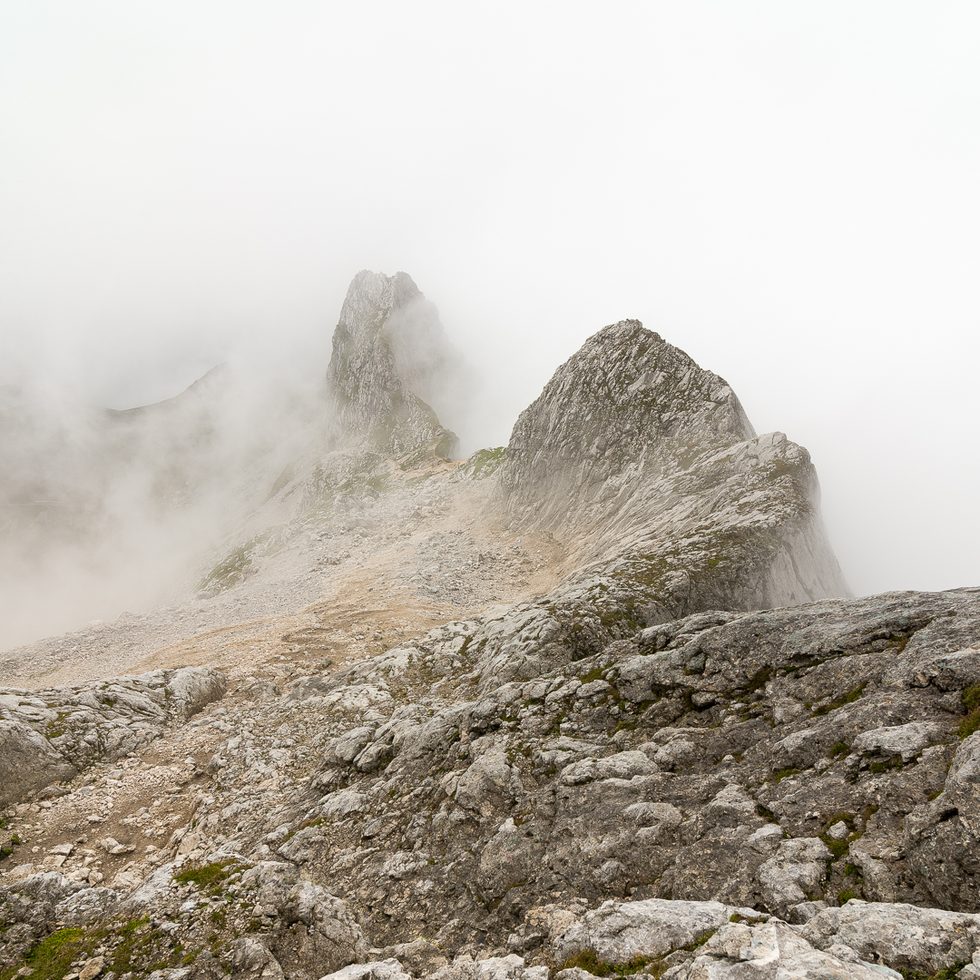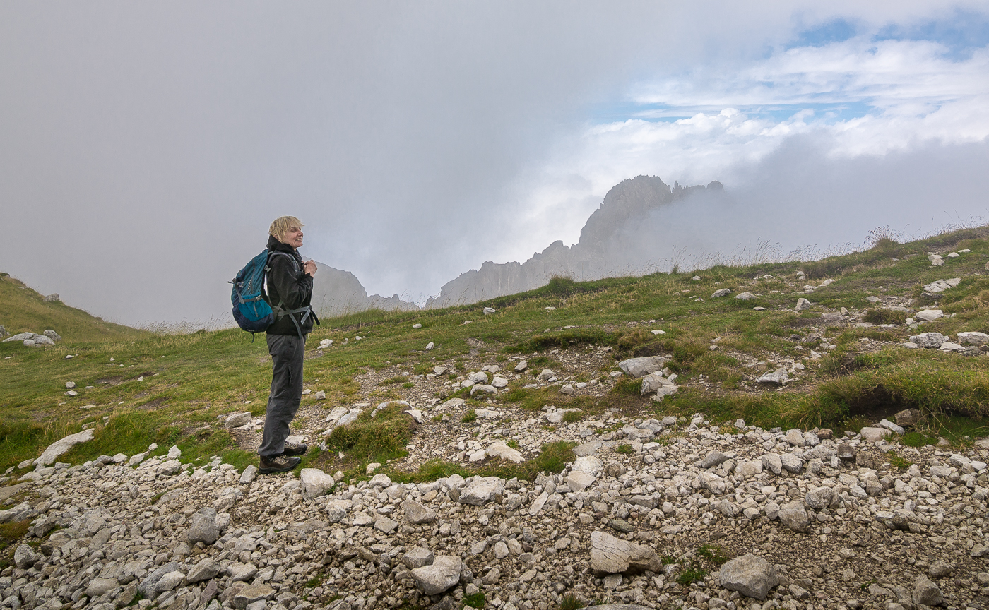 I zaraz potem zrobiło się jeszcze bardziej nieprzyjemnie. Mocno się ściemniło i musieliśmy znowu wejść w chmurę, co ograniczyło nam widoczność do paru metrów. Grzmoty burzy w oddali wcale nas nie pokrzepiały, ale jednak mocno motywowały do wzmożonego wysiłku. O lepszej wakacyjnej przygodzie nie mogłem marzyć. :) Dopóki szliśmy ścieżką nie było problemu. Lecz gdy doszliśmy do piargów zaczęliśmy co chwila gubić drogę. Samo w sobie oznaczenie trasy jest tam raczej kiepskie, a co dopiero mówić o miejscach na ruchomych gołoborzach. Po prawej stronie zejścia w nieokreślonej odległości w takich warunkach jest urwisko. Trzeba było uważać, aby za bardzo nie posunąć się w tamtym kierunku.... Jednak nie zależało nam na tym, aby zbyt szybko znaleźć się na dole :mrgreen:. Schodzenie w tych warunkach i kluczenie w poszukiwaniu szlaku zajęło nam około godziny, a pokonaliśmy zaledwie około 350m wysokości. Jedno nas bardzo ucieszyło. Burza zaczęła się oddalać. A po jakichś kilkuset metrach wydostaliśmy się z chmury.