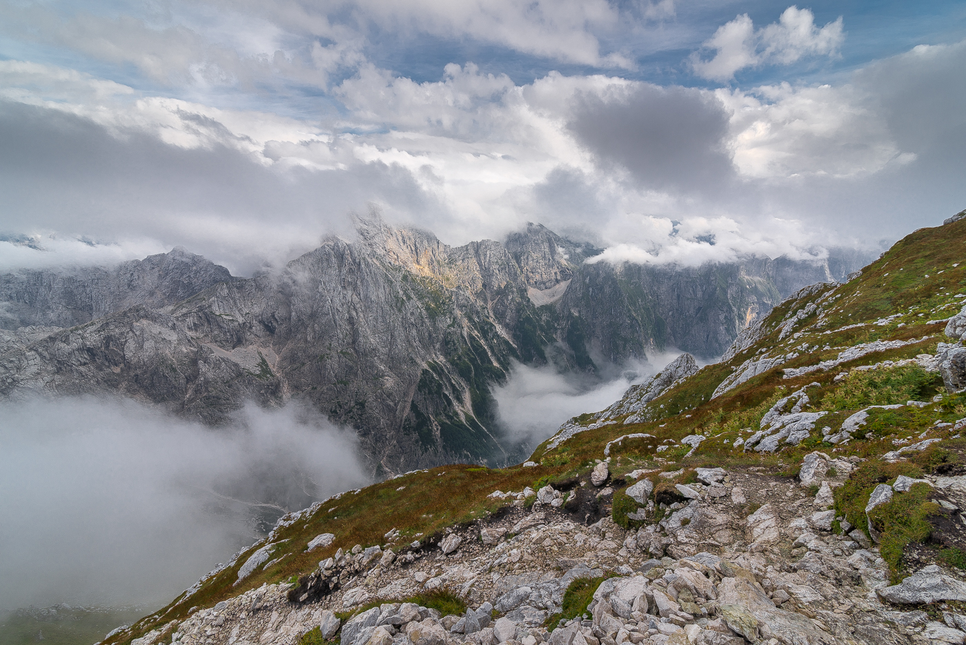 Warun jak widać bajeczny. Widoki we wszystkich kierunkach nieziemskie. Czułem się jak zawieszony pomiędzy ziemią a niebem. Idylla by trwała jeszcze długo.... No może do zachodu słońca :), gdyby nie dotarł do nas dość specyficzny odgłos...... Gdzieś z okolic Triglawa coraz wyraźniej dochodziły odgłosy burzy.....Poczułem się jak na strzelnicy..... ale raczej po stronie ustawionych tarcz :).