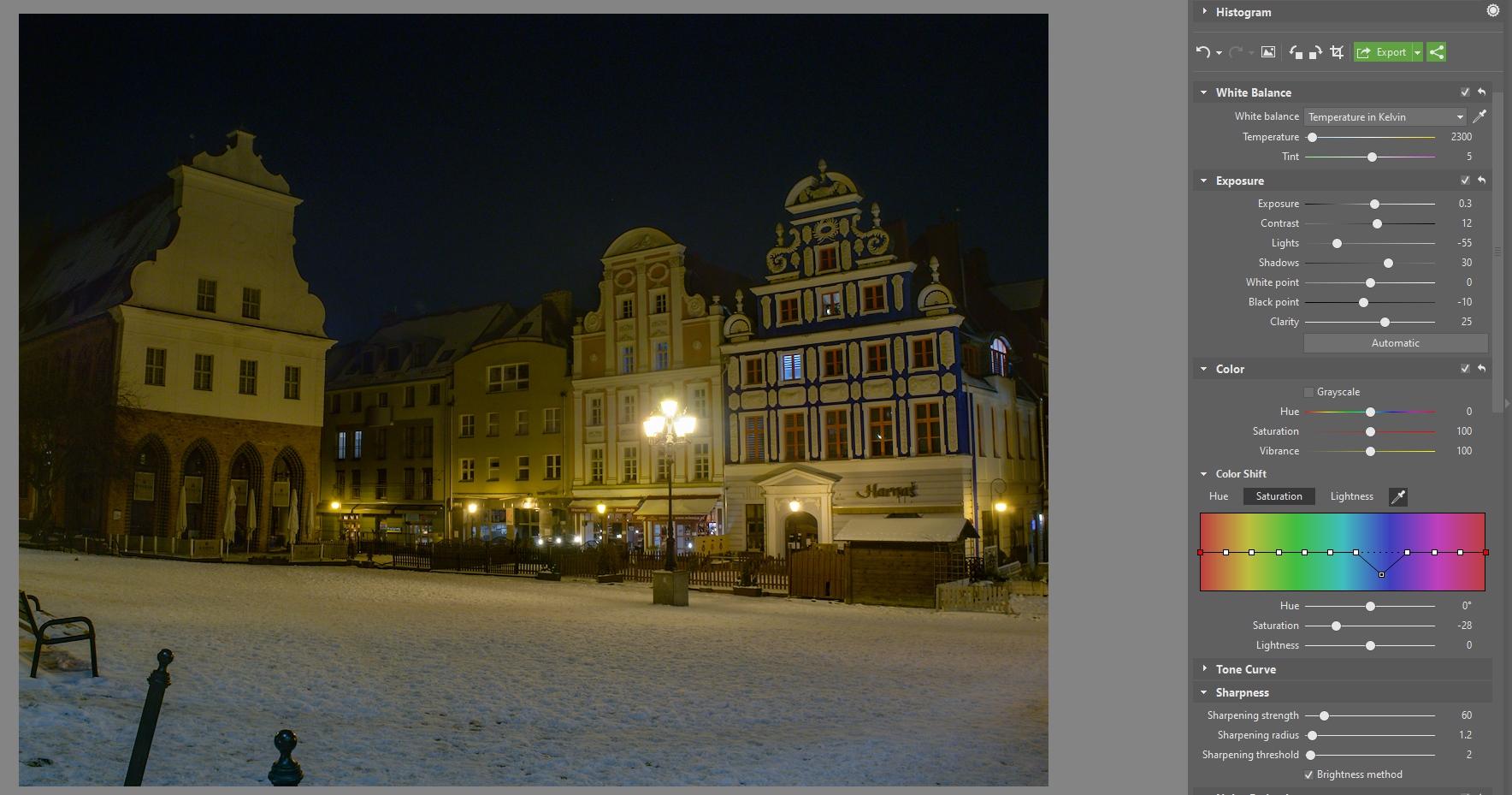 Oczywiście zdjąłem ten przeważający żółć, który aż tryska miejscami zielenią ;) ochłodziłem WB, dodałem ciut pomarańczy :), zwiększyłem tint w stronę fioletu, bo mi zielonka się robiła. Popatrzyłem sobie na śnieg na dachach, myślę ok... i to jest efekt...