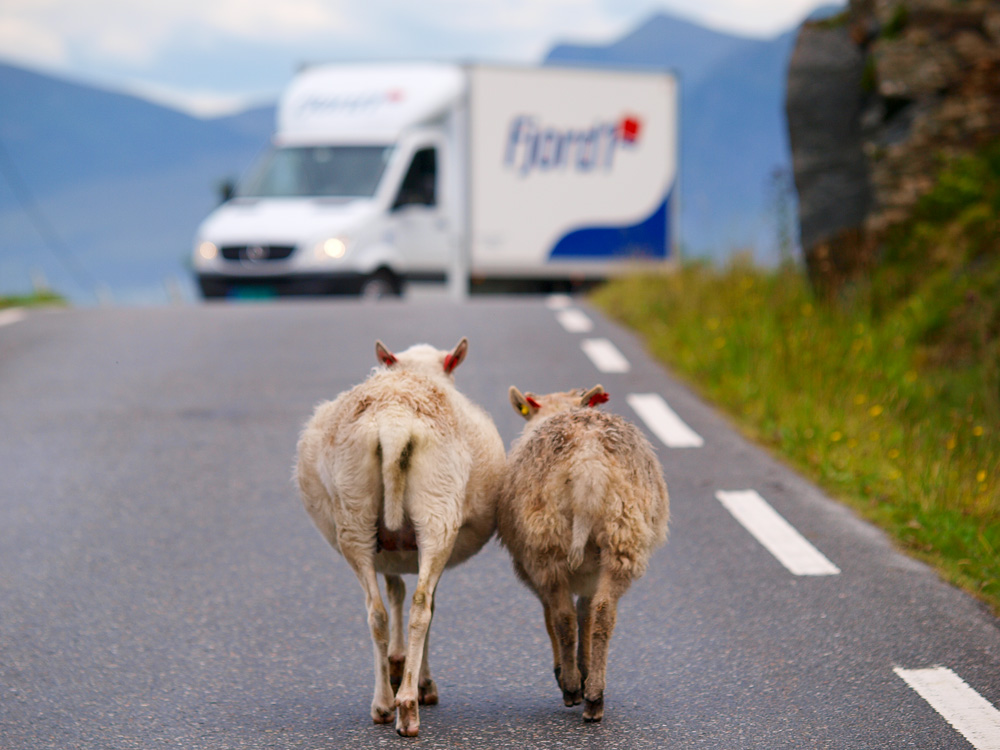 Owce - których w Norwegii jest bez liku łażą gdzie chcą i robią co chcą nie bojąc się nawet samochodów :) kładą się nawet na środku głównych dróg krajowych - na ogół za ostrym zakrętem i na zwężeniu dróg :)